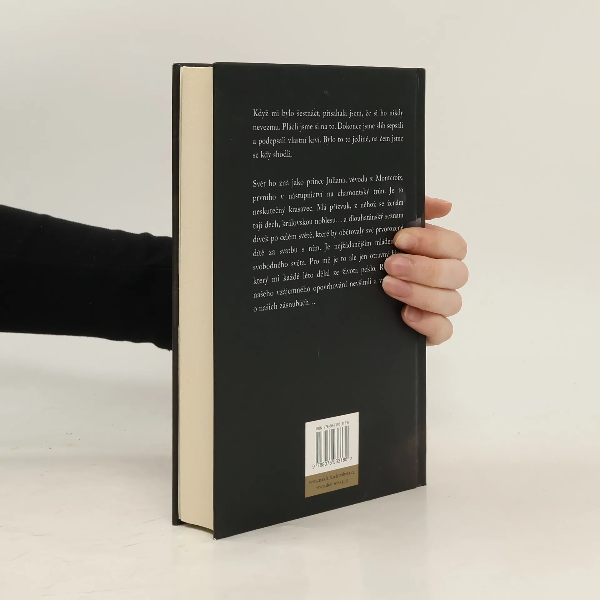 Když mi bylo šestnáct, přísahala jsem, že jeho si nikdy nevezmu. Plácli jsme si na to. Dokonce jsme slib sepsali a podepsali vlastní krví. Bylo to to jediné, na čem jsme se kdy shodli. Svět ho zná jako prince Juliana, vévodu z Montcroix, prvního v nástupnictví na chamontský trůn. Má přízvuk, z něhož se ženám tají dech. Královskou noblesu. Oslnivý vzhled. Je to neskutečný krasavec. A má dlouhatánský seznam dívek po celém světě, které by obětovaly své prvorozené dítě za svatbu s ním. Je nejžádanějším mládencem svobodného světa. Ale pro mě je to jen syn otcova nejlepšího přítele – otravný kluk, který mi každé léto dělal ze života peklo. Rodiče si našeho vzájemného opovrhování nevšimli a vtipkovali o našich zásnubách…