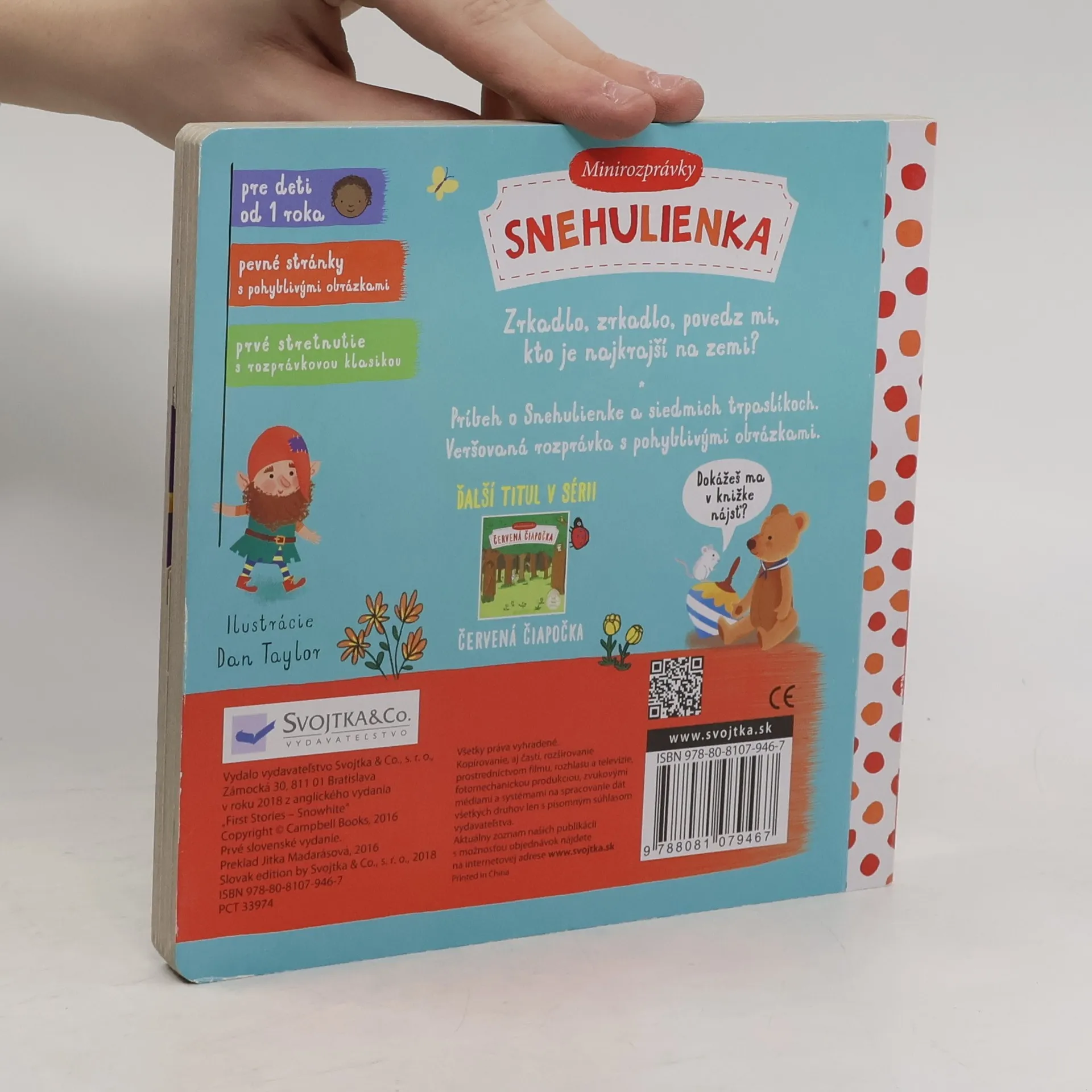 Príbeh o Snehulienke a siedmich trpaslíkoch. Veršovaná rozprávka s pohyblivými obrázkami. Zrkadlo, zrkadlo povedz mi, kto je najkrajší na zemi? Toto malé detské rozprávkové leporelo s pevnými stránkami a pohyblivými obrázkami je určené deťom od jedného roka. Nájdete v ňom krátku veršovanú rozprávku o Snehulienke a siedmich trpaslíkoch. Pri jej počúvaní si deti môžu precvičovať jemnú motoriku a zároveň si rozprávkový príbeh oživiť – Snehulienka začne tancovať s trpaslíkmi, v zrkadle sa objaví zlá kráľovná, Snehulienka zje jablko a zavrie oči... Tak hor sa do čítania! Minirozprávka o Snehulienke už na vás čaká! pevné stránky s pohyblivými obrázkami
