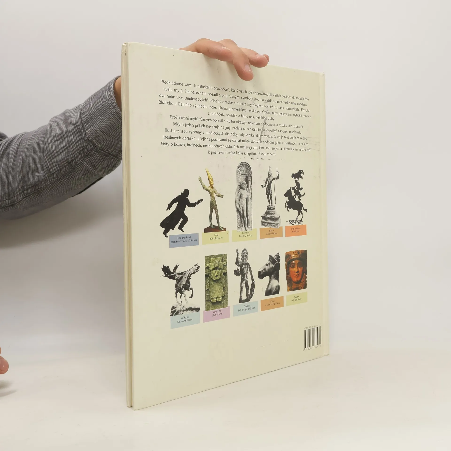 Předkládáme vám "turistického průvodce", který vás bude doprovázet při vašich cestách do rozsáhlého světa mýtů. Na barevném pozadí a pod různými symboly jsou na každé stránce vede sebe uvedeny dva nebo více "nadčasových" příběhů z řecké a římské mytologie a rovněž i z tradic starověkého Egypta, Blízkého a Dálného východu, Indie, islám a amerických civilizací. Opomenuty nejsou ani mytické motivy z pohádek, povídek a filmů naší neklidné doby. Srovnávání mýtů různých oblastí a kultur ukazuje nejenom podobnosti a rozdíly, ale i způsob, jakým jeden příběh navazuje na jiný, prolíná se s ostatními a vyvolává asociaci myšlenek. Ilustrace jsou vybrány z uměleckých děl doby, kdy vznikal daný mýtus; často je text doplněn řadou kreslených obrázky, s jejichž postavami se čtenář může ztotožnit podobně jako v kreslených seriálech. Mýty o bozích, hrdinech, neskutečných obludách zůstávají tím, čím jsou: živým a stimulujícím nástrojem k poznávání světa lidí a k lepšímu životu v něm.