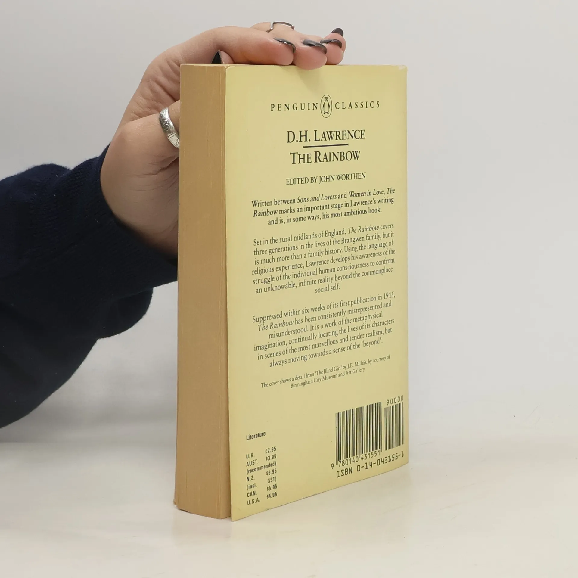 "Set in the rural Midlands of England, The Rainbow (1915) revolves around three generations of the Brangwens, a strong, vigorous family, deeply involved with the land. When Tom Brangwen marries a Polish widow, Lydia Lensky, and adopts her daughter Anna as his own, he is unprepared for the passion that erupts between them. All are seeking individual fulfillment, but it is Ursula, Anna's spirited daughter, who, in her search for self-knowledge, rejects the traditional role of womanhood." "In his introduction, James Wood discusses Lawrence's writing style and the tensions and themes of The Rainbow. This Penguin edition reproduces the Cambridge text, which provides a text as close as possible to Lawrence's original. It also includes suggested further reading, a fragment of 'The Sisters II' from his first draft, and chronologies of Lawrence's life and of The Rainbow's Brangwen family."--BOOK JACKET.
