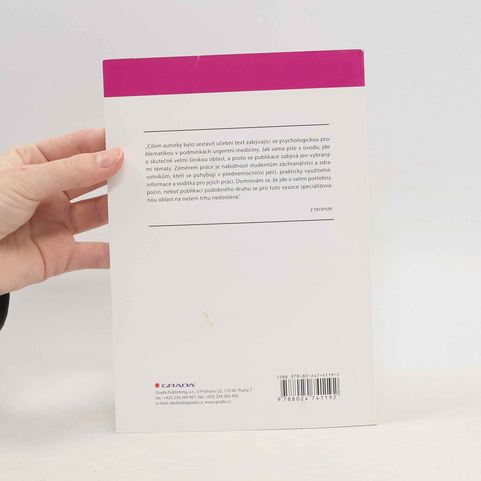 Kniha se zabývá základní psychologickou problematikou pacienta a záchranáře v přednemocniční péči. Jejím cílem je zprostředkovat poznatky z psychologie lékařské, zdravotnické, psychologie zdraví a nemoci a v neposlední řadě také komunikace v kontextu urgentní medicíny. Publikací, které se zabývají psychologií a komunikací ve zdravotnictví, je na trhu poměrně dostatek, nicméně podobná, věnující se problematice akutního ohrožení zdraví, zcela chybí.
