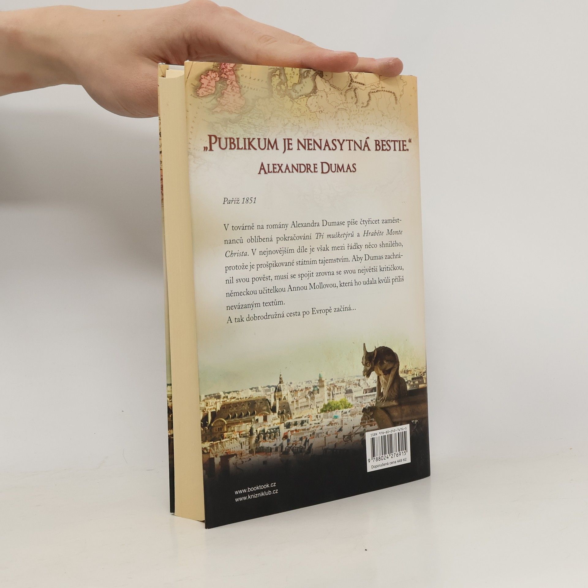 Paříž 1851. V továrně na romány Alexandra Dumase píše čtyřicet zaměstnanců oblíbená pokračování Tří mušketýrů a Hraběte Monte Christa. V nejnovějším díle je však mezi řádky něco shnilého, protože je prošpikované státním tajemstvím. Aby Dumas zachránil svou pověst, musí se spojit zrovna se svou největší kritičkou, německou učitelkou Annou Mollovou, která ho udala kvůli příliš nevázaným textům. A tak jejich dobrodružná cesta po Evropě začíná Tento román Dirka Husemanna získal v roce 2020 v Německu titul KNIHA ROKU.