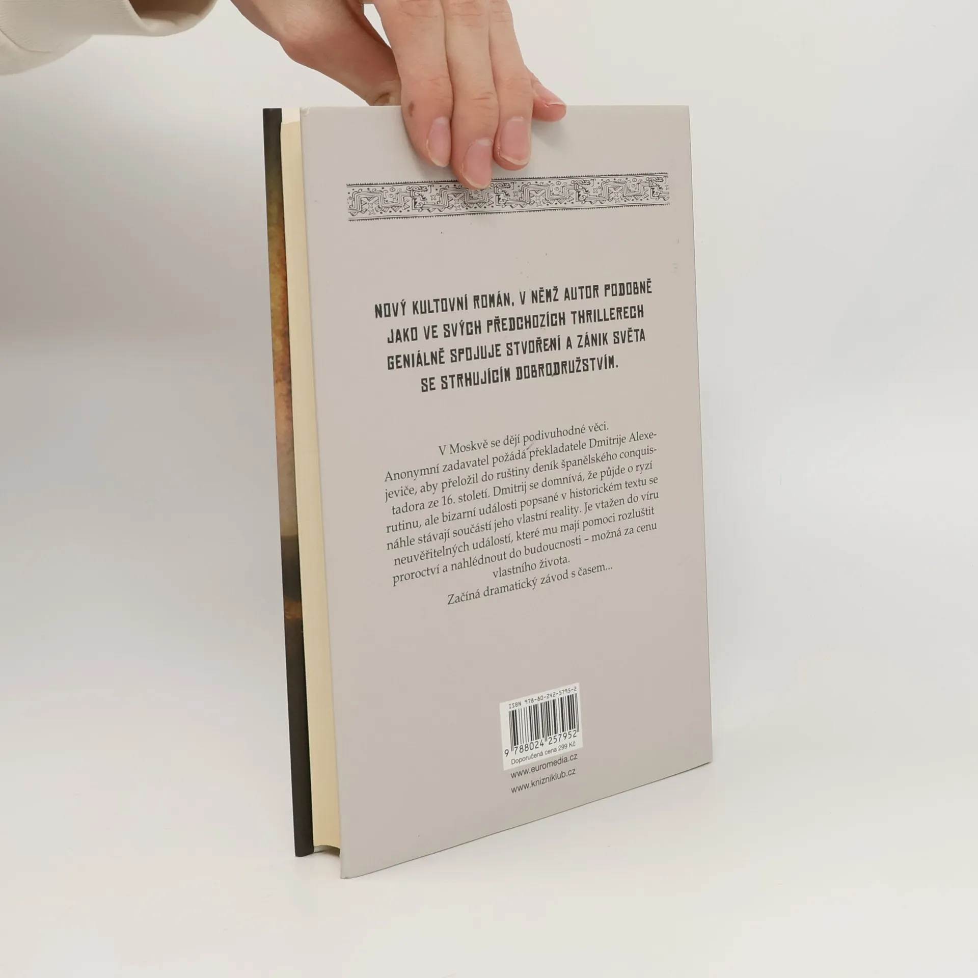Nový kultovní román, v němž autor podobně jako ve svých předchozích románech geniálně spojuje stvoření a zánik světa se strhujícím dobrodružstvím. V Moskvě se dějí podivuhodné věci. Anonymní zadavatel požádá překladatele Dmitrije Alexejeviče, aby přeložil do ruštiny deník španělského conquistadora ze 16. století. Dmitrij se domnívá, že půjde o ryzí rutinu, ale bizarní události popsané v historickém textu se náhle stávají součástí jeho vlastní reality. Je vtažen do víru neuvěřitelných událostí, které mu mají pomoci rozluštit proroctví a nahlédnout do budoucnosti – možná za cenu vlastního života. Začíná dramatický závod s časem...