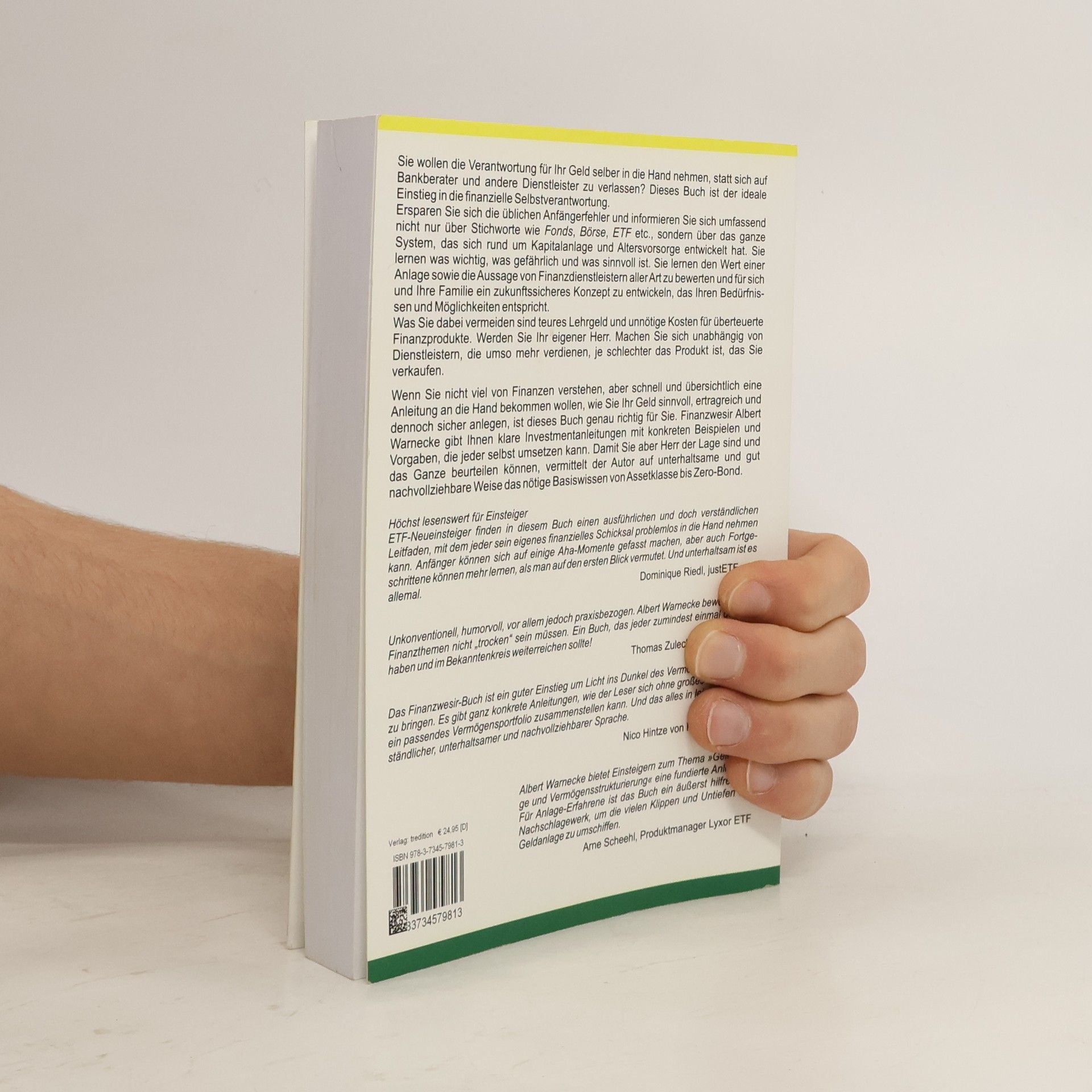 Sie wollen wissen, wie Sie Ihr Geld anlegen sollen, um sich eine sichere und rentable Altersvorsorge aufzubauen, mit der Sie Ihren Lebensstandard halten können? Sie wollen einen "Leitfaden", der Ihnen erklärt, wie Sie als Aktien-Anfänger in 10 bis 20 Jahren ein (kleines) Vermögen aufbauen? In diesem Buch präsentiert Ihnen Albert Warnecke 20 Jahre Geld- und Börsenerfahrung in 9 Kapiteln auf rund 450 Seiten. Das Buch ist eine Mischung aus philosophisch-psychologischen Grundlagen und knallharten Excel-Kalkulationen. Geschrieben aus der Opfer-Perspektive, denn der Autor hat sich beim Lehrgeldzahlen für die Premiumvariante entschieden. Sie müssen nicht jede Erfahrung selbst machen. Lassen Sie den Autor Ihr Sherpa durch die fünf Ebenen der Geldanlage sein