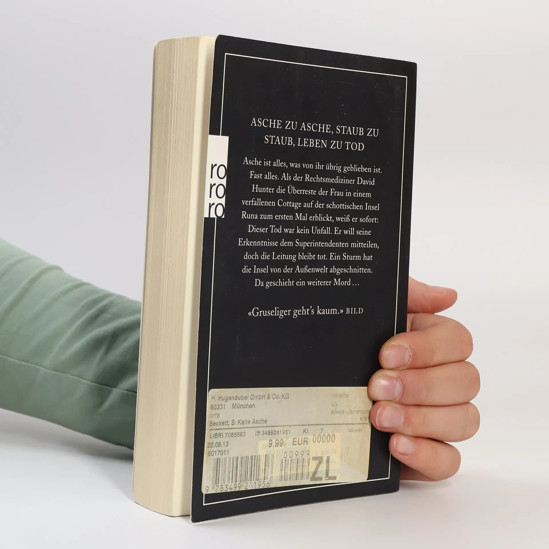 Asche zu Asche, Staub zu Staub, Leben zu Tod. Asche ist alles, was von ihr übrig geblieben ist. Fast alles. Als der Rechtsmediziner David Hunter die Überreste der Frau in einem verfallenen Cottage auf der schottischen Insel Runa zum ersten Mal erblickt, weiß er sofort: Dieser Tod war kein Unfall. Er will seine Erkenntnisse dem Superintendenten mitteilen, doch die Leitung bleibt tot. Ein Sturm hat die Insel von der Außenwelt abgeschnitten. Da geschieht ein weiterer Mord. «Gruseliger geht’s kaum.» (Bild)