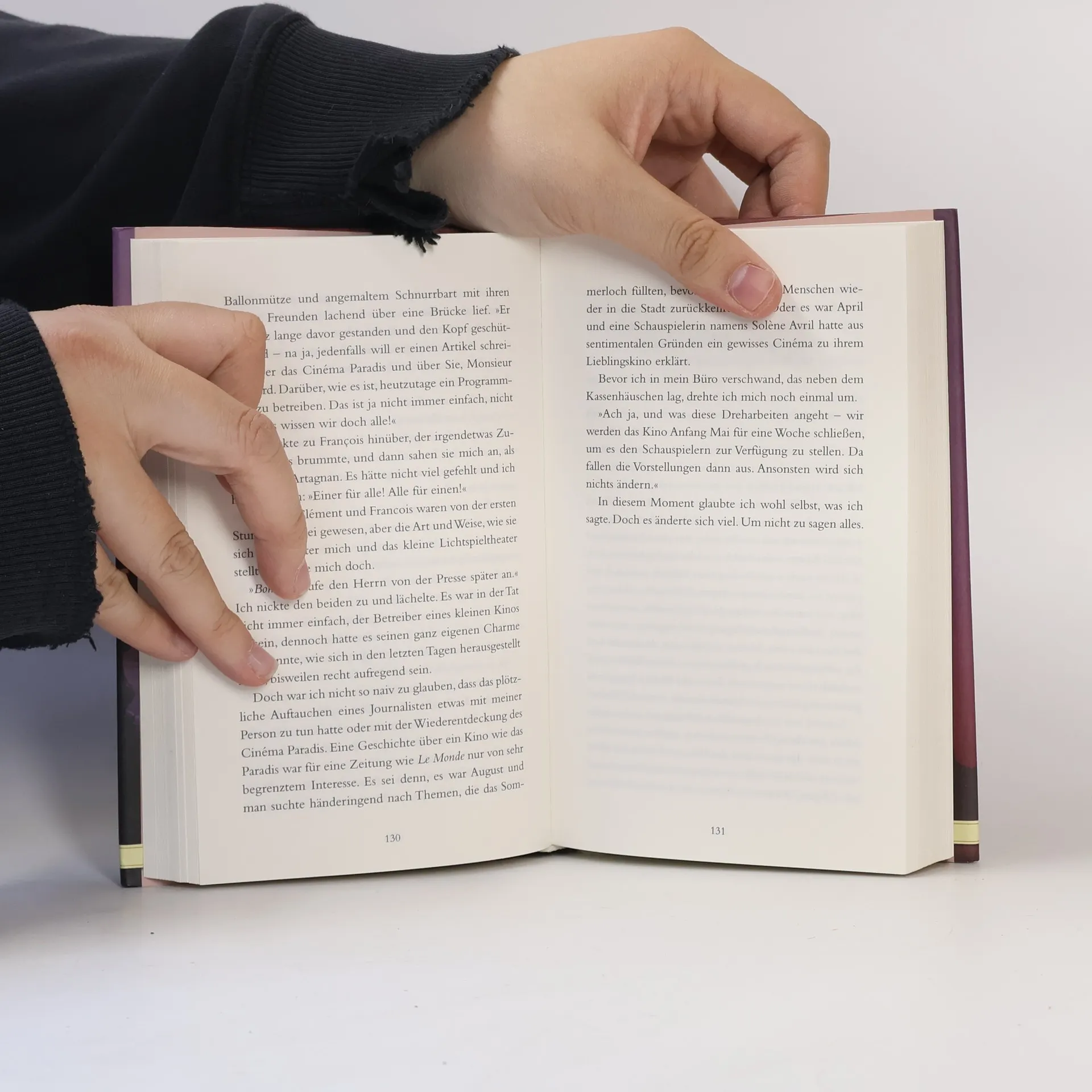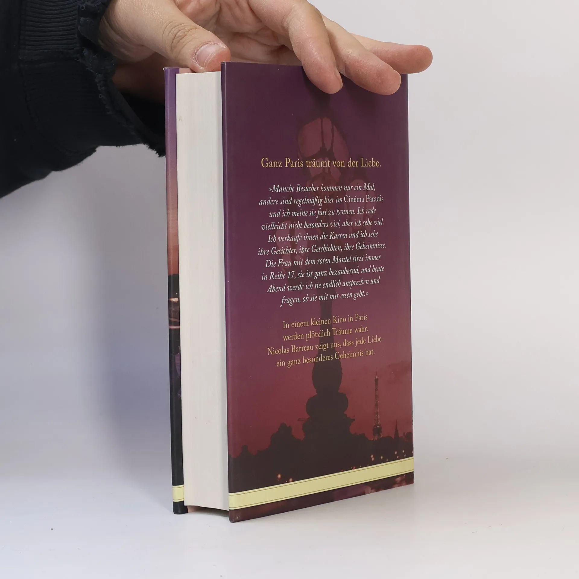 "Manche Menschen kommen nur ein Mal, andere sind regelmäßig hier im Cinéma Paradies und ich meine sie fast zu kennen. Ich rede vielleicht nicht besonders viel, aber ich sehe viel. Ich verkaufe ihnen die Karten und ich sehe ihre Gesichter, ihre Geschichten, ihre Geheimnisse. Die Frau mit dem roten Mantel sitzt immer in Reihe 17, sie ist ganz bezaubernd, und heute Abend werde ich sie endlich ansprechen und fragen, ob sie mit mir essen geht."