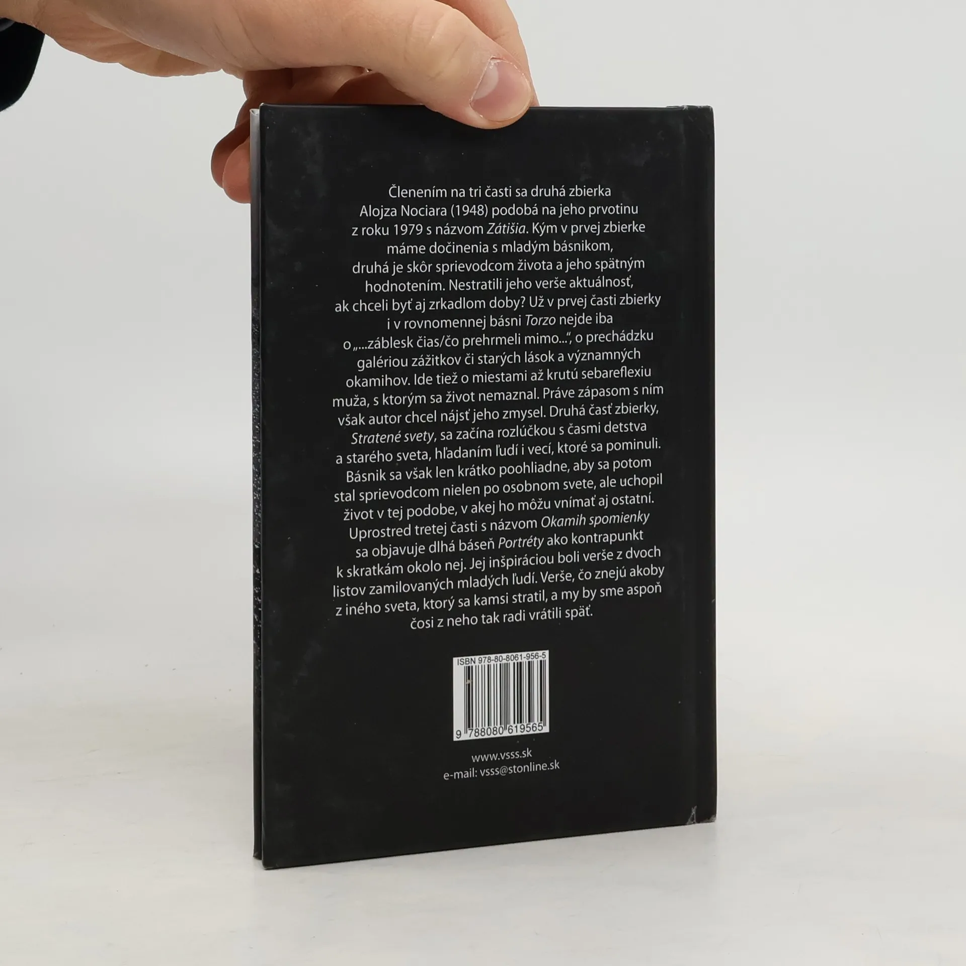 Členením na tri časti sa druhá zbierka Alojza Nociara (1948) podobá na jeho prvotinu z roku 1979 s názvom Zátišia. Kým v prvej zbierke máme dočinenia s mladým básnikom, druhá je skôr sprievodcom života a jeho spätným hodnotením. Nestratili jeho verše aktuálnosť, ak chceli byť aj zrkadlom doby? Už v prvej časti zbierky i v rovnomennej básni Torzo nejde iba o „...záblesk čias/čo prehrmeli mimo...“, o prechádzku galériou zážitkov či starých lások a významných okamihov. Ide tiež o miestami až krutú sebareflexiu muža, s ktorým sa život nemaznal. Práve zápasom s ním však autor chcel nájsť jeho zmysel. Druhá časť zbierky, Stratené svety, sa začína rozlúčkou s časmi detstva a starého sveta, hľadaním ľudí i vecí, ktoré sa pominuli. Básnik sa však len krátko poohliadne, aby sa potom stal sprievodcom nielen po osobnom svete, ale uchopil život v tej podobe, v akej ho môžu vnímať aj ostatní. Uprostred tretej časti s názvom Okamih spomienky sa objavuje dlhá báseň Portréty ako kontrapunkt k skratkám okolo nej. Jej inšpiráciou boli verše z dvoch listov zamilovaných mladých ľudí. Verše, čo znejú akoby z iného sveta, ktorý sa kamsi stratil, a my by sme aspoň čosi z neho tak radi vrátili späť.
