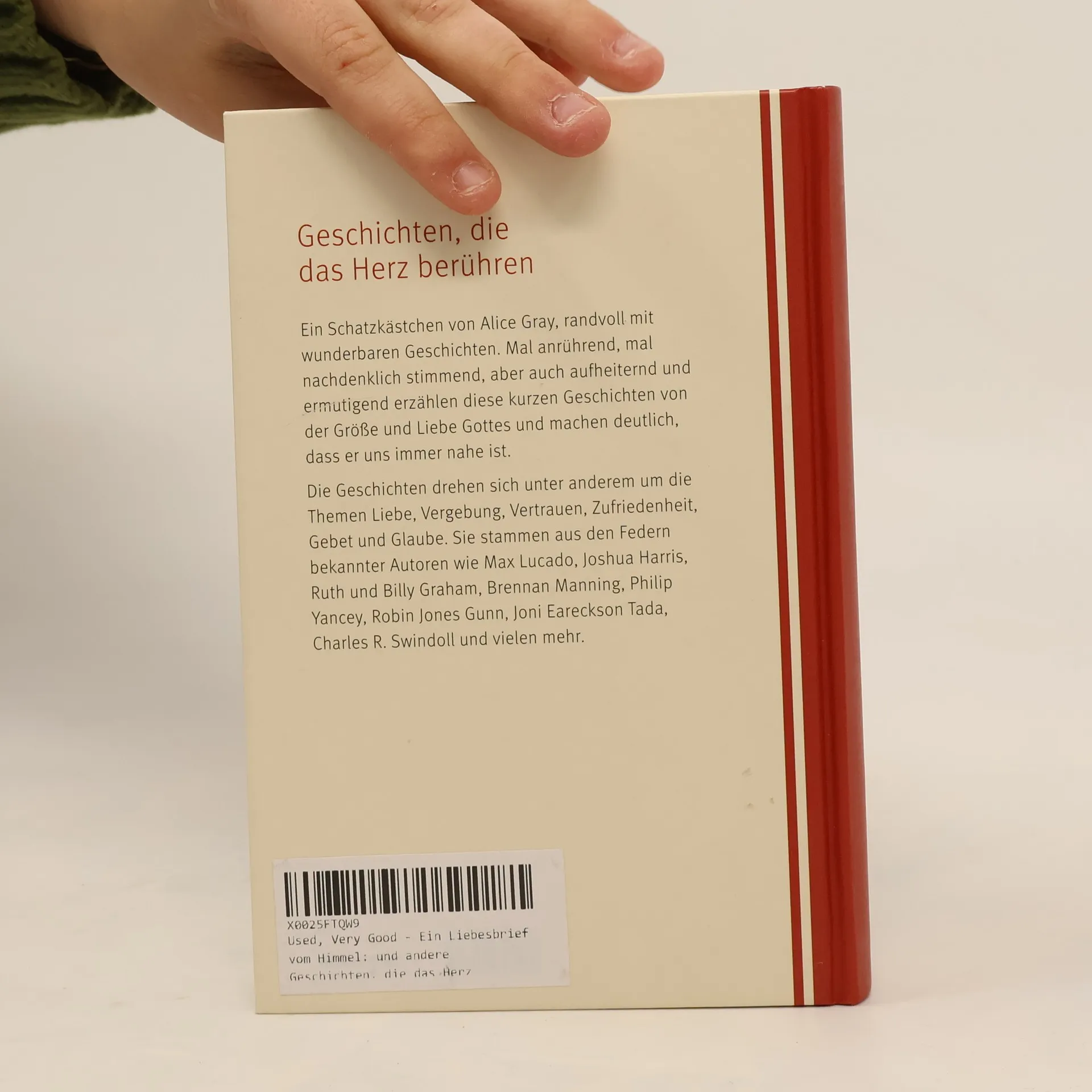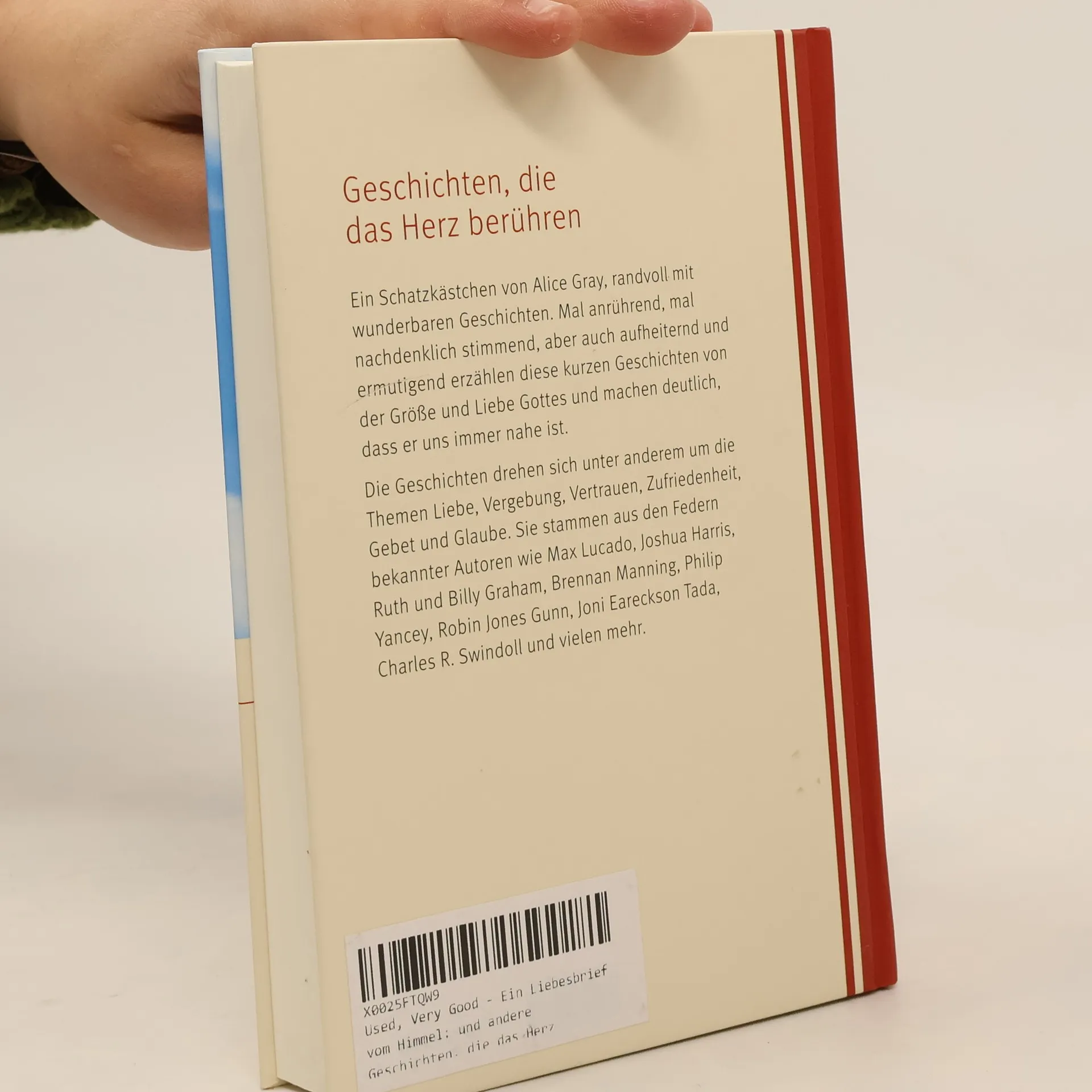 Ein Schatzkästchen von Alice Gray - randvoll mit Geschichten für die ganze Familie. Mal anrührend, mal nachdenklich stimmend, aber auch aufheiternd und ermutigend erzählen diese kurzen Geschichten von der Größe und Liebe Gottes und machen deutlich, dass er uns immer nah ist. Die in diesem Buch enthaltenen Geschichten drehen sich unter anderem um die Themen Liebe, Vergebung, Vertrauen und Zufriedenheit, Gebet und Glaube. Sie stammen aus den Federn von bekannten Autoren wie Max Lucado, Charles R. Swindoll, Ruth und Billy Graham, Brennan Manning, Philip Yancey, Joni Eareckson Tada, Joshua Harris und vielen mehr.