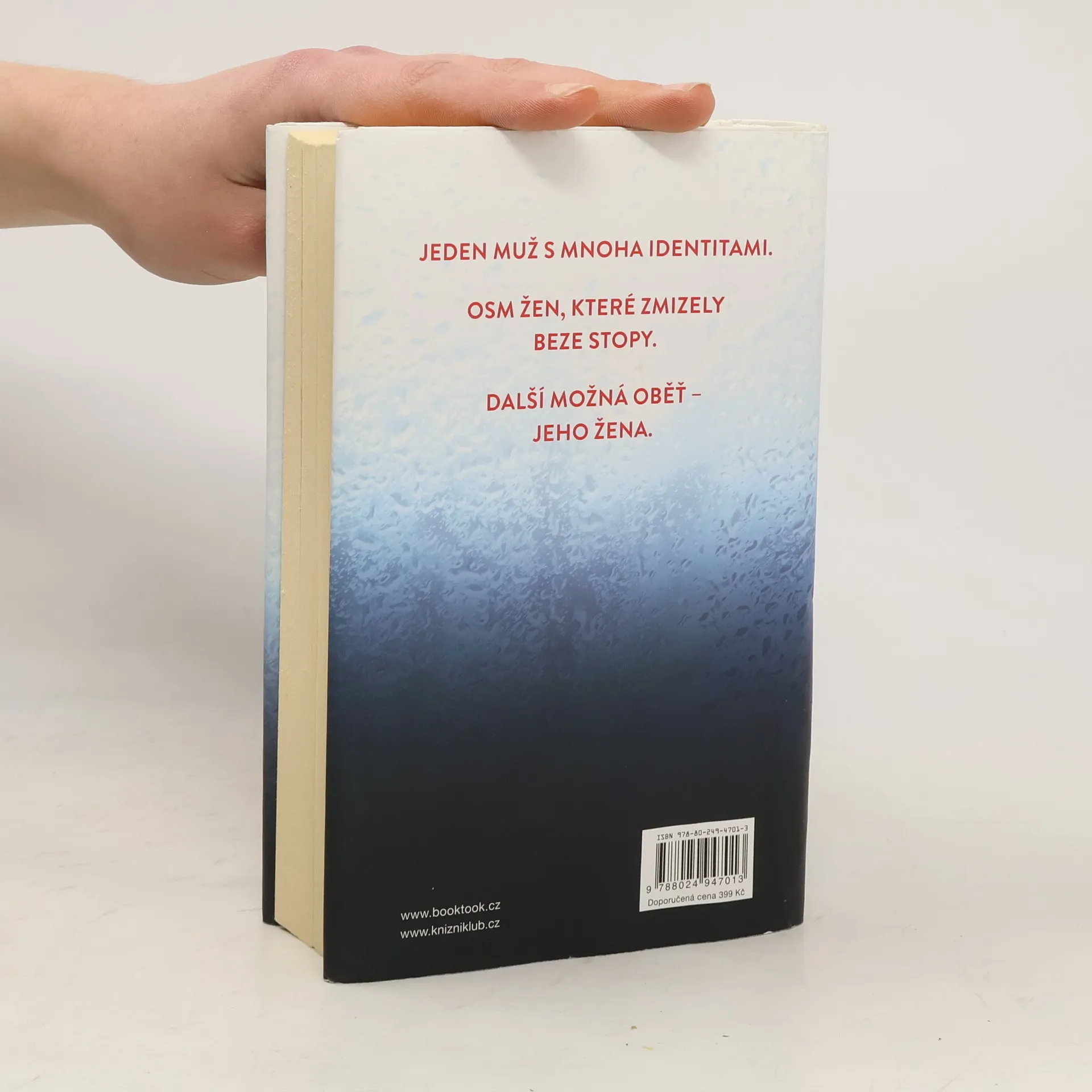 Jeden muž s mnoha identitami. Osm žen, které zmizely beze stopy. Další možná obět...jeho žena. Agent FBI Drex Easton je neúnavně hnán jediným cílem: dostat podvodníka dříve známého jako Weston Graham. Za posledních třicet let vystřídal Weston mnoho jmen a bezpočet převleků, aby vylákal bohatství z osmi zámožných žen, které pak zmizely beze stopy. Jediný společný znak v životě všech obětí je nový muž, který vždy rovněž zmizí a nezanechá žádný důkaz o své existenci. Drex je přesvědčen, že všechny tyto ženy zabil sociopat Weston Graham. Ale pokaždé, když se Drex přiblíží k tomu, aby ho chytil, Weston změní identitu a znovu mu unikne. Teď poprvé v dlouhé hře na kočku a myš má Drex podezřelého konečně v dohledu. Jasper Ford je atraktivní a okouzlující muž, který se nedávno oženil s úspěšnou podnikatelkou Talií Shaferovou. Drex se jim vloudí do života jako jejich nový soused, aby je mohl z blízka sledovat. Čím je k páru blíž, tím více je přesvědčen, že Jasper je přesně ten chytrý a nemilosrdný predátor, kterého tak dlouho hledá, a zároveň že jeho vlastní přitažlivost k Talii může ohrozit celé vyšetřování. Toto je Drexova poslední šance, jak dostat svého mazaného nepřítele dřív, než bude znovu vraždit a podaří se mu navždy uniknout spravedlnosti. Nejdřív však musí zjistit, zda je Talia bezcitným spolupachatelem...nebo další obětí.