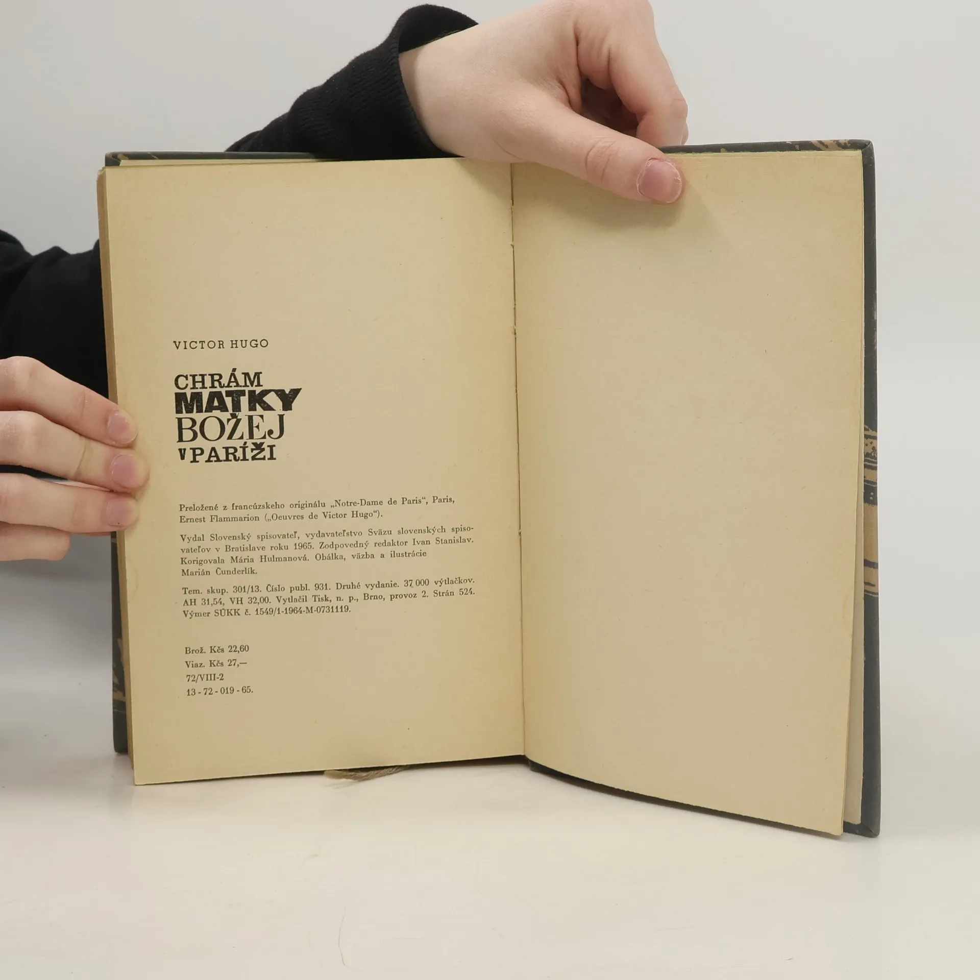 "Victor Hugo, jeden z najslávnejších predstaviteľov svetovej literatúry, sa do sŕdc miliónov čitateľov zapísal ako autor mnohých vynikajúcich prozaických, básnických i dramatických diel. Azda najznámejšie z nich je jeho historický román Chrám Matky Božej v Paríži (1831), ktorý po rokoch ponúkame slovenským čitateľom v novom vydaní. V monumentálnej románovej freske ožíva pred našimi očami nielen tragický príbeh znetvoreného zvonára Quasimoda a krásnej Cigánky Esmeraldy, ale aj sám Paríž pätnásteho storočia – stredoveké mesto so svojou magickou atmosférou, úzkymi uličkami a námestiami, nespočetnými vežami a kostolmi, medzi ktorými dominuje Chrám Matky Božej, nádherná majestátna katedrála, s ktorou sú nerozlučne späté osudy hlavných hrdinov. Ich príbeh dotvára množstvo epizód, kde sa vystrieda veľa postáv z najrozličnejších spoločenských vrstiev vrátane tých najvyšších. Do centra románu sa však postupne dostáva ľud – parížska chudoba, živelne sa búriaca proti cirkevnej tyranii a objavujúca svoje ušľachtilé jadro, lásku a ľudskosť uprostred stredovekej krutosti a tmy. Hugov nesmrteľný román nepochybne upúta i dnešného čitateľa svojou dramatickosťou, dejom plným neočakávaných zvratov a najrozmanitejších prekvapení." (Anotácia vydavateľstva) Siedme (hoci uvedené ako prvé - pravdepodobne prvé v danom vydavateľstve) slovenské vydanie v tomto preklade.... celý text