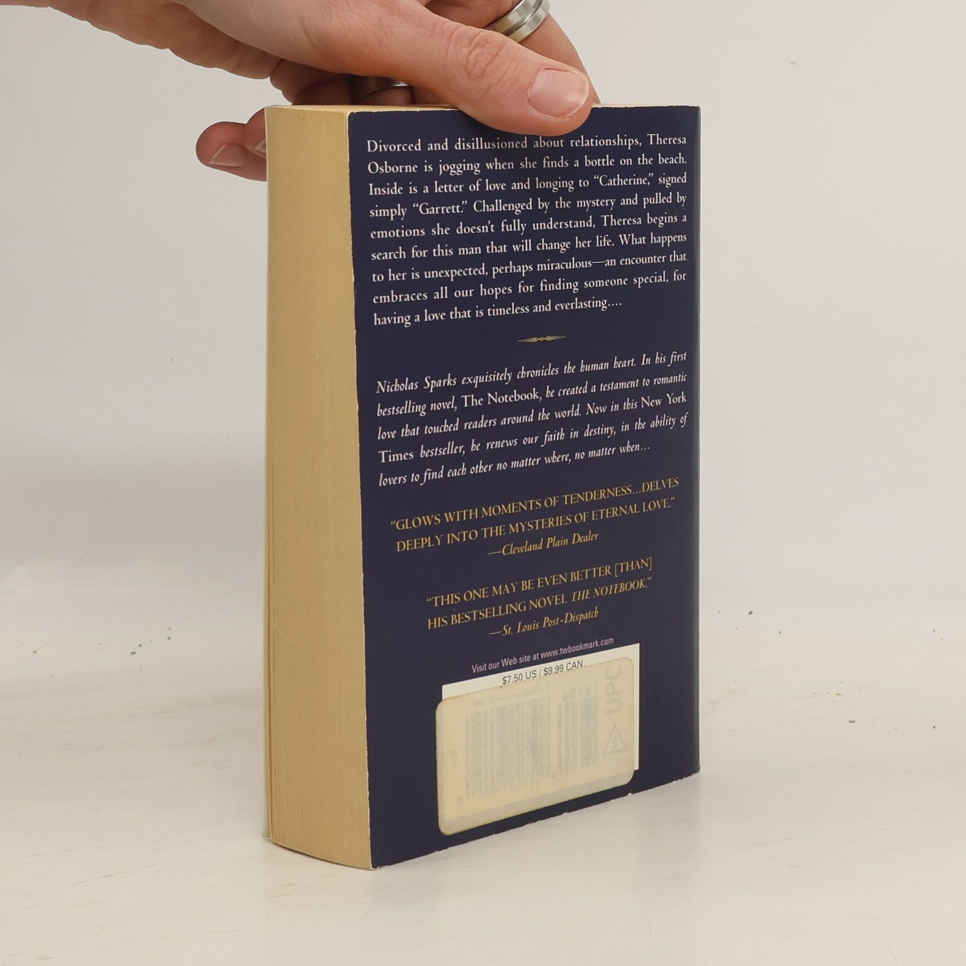 In this New York Times bestseller, a single mother sets out to find the North Carolina man who sent a message meant for someone else . . . and the journey may change her life forever. Divorced and disillusioned about relationships, Theresa Osborne is jogging when she finds a bottle on the beach. Inside is a letter of love and longing to "Catherine," signed simply "Garrett." Challenged by the mystery and pulled by emotions she doesn't fully understand, Theresa begins a search for this man that will change her life. What happens to her is unexpected, perhaps miraculous-an encounter that embraces all our hopes for finding someone special, for having a love that is timeless and everlasting.... Nicholas Sparks exquisitely chronicles the human heart. In his first bestselling novel, The Notebook, he created a testament to romantic love that touched readers around the world. Now in this New York Times bestseller, he renews our faith in destiny, in the ability of lovers to find each other no matter where, no matter when...