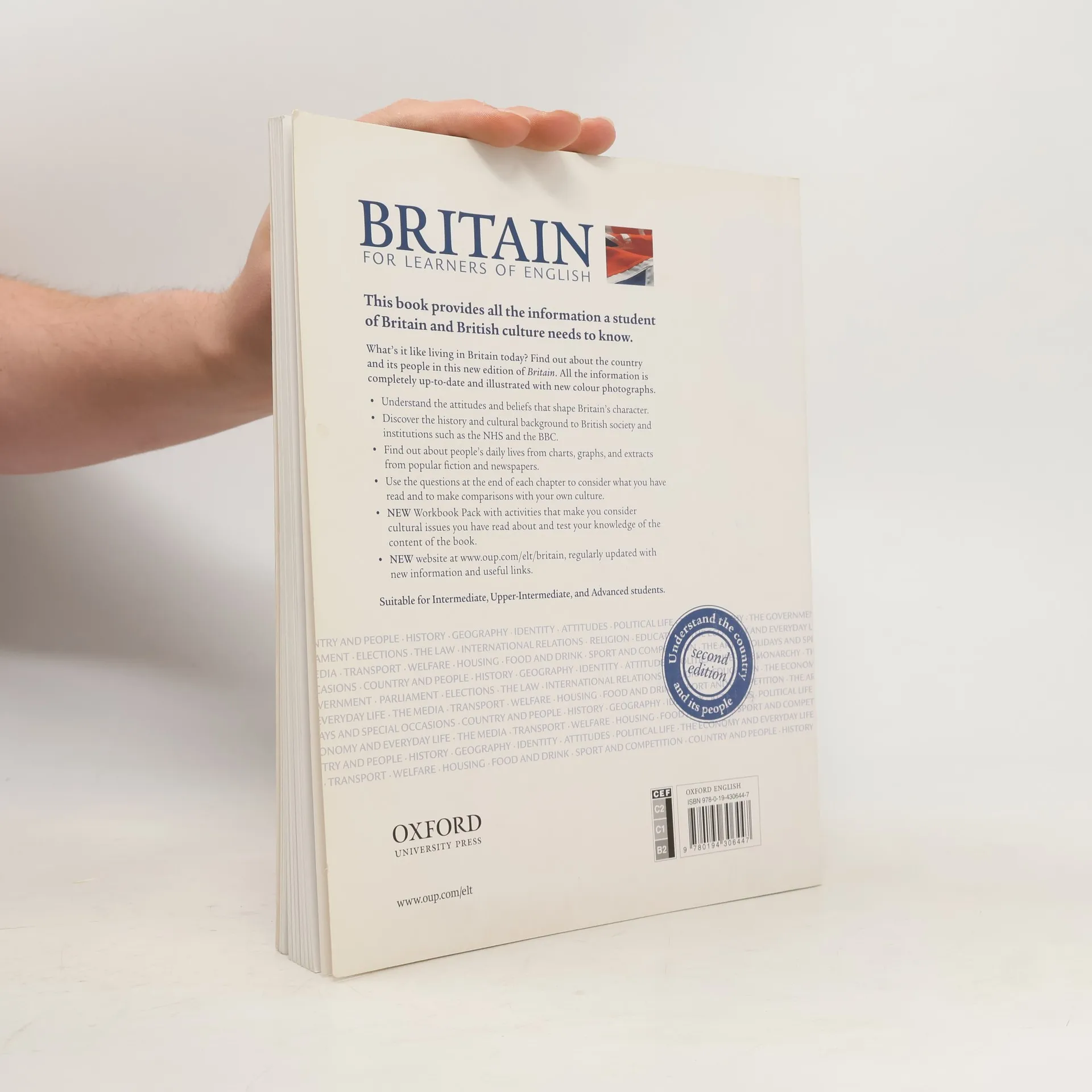 This book provides all the information a student od Britain and British culture needs to know.What's it like living ib Britain today? Find out about the country and its people in this new edition of Britain. All the information is completely up-to-date and illustrated with new colour photographs.Key features* Gives students a real insight into what it means to live in Britain today.* Provides the historical and cultural background of British society and institutions, as well as the private daily life of the British people.* Charts, graphs, extracts from popular fiction and newspapers etc. provide additional information.* Questions at the end of each chapter encourage analysis of the text and cross-cultural comparison.* Updated with new photographs and illustrations.* NEW Workbook with activities to encourage students to think about cultural issues raised in the book, to make comparisons with their own culture, and to revise and reinforce the book's content and language.* NEW website, regularly updated with new information and statistics plus useful links to media and government websites.