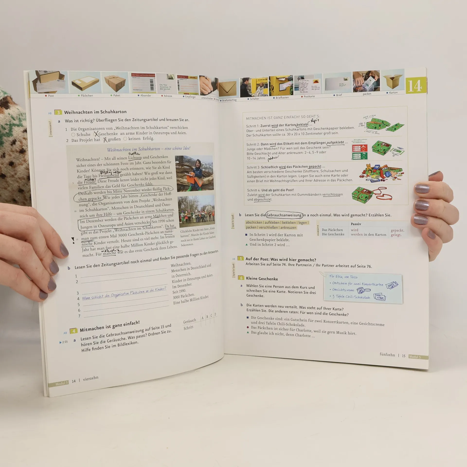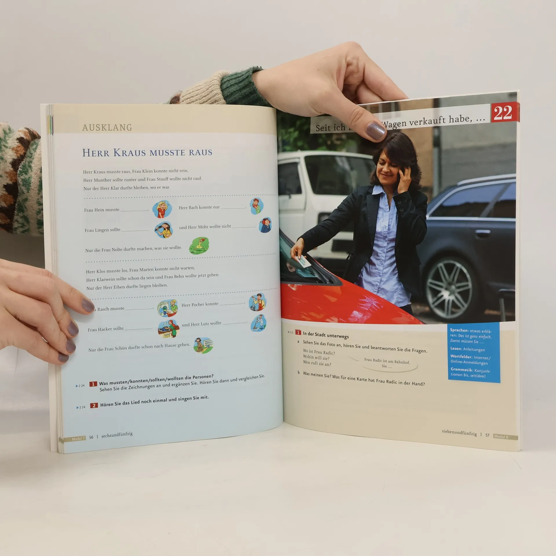 Zielniveau A2.2 Kursbuch der sechsbändigen Ausgabe mit Audios online Teilband Niveau A2.2 - die Lektionen umfassen je vier Seiten und folgen einem transparenten, wiederkehrenden Aufbau: - jede Lektion beginnt mit einer interessanten Einstiegssituation – meist mit einem Hörtext kombiniert –, die in die Thematik der Lektion einführt und Emotionen und Interesse weckt - auf der folgenden Doppelseite werden, ausgehend von der Einstiegssituation, die neuen Wortfelder, die Strukturen und Redemittel anhand von authentischen Lese- und Hörtexten eingeführt und geübt - das neue Wortfeld der Lektion wird in der Kopfzeile prominent und gut memorierbar als Bildlexikon präsentiert - Abschlussseite: Schreibtraining, Sprechtraining oder Mini-Projekte greifen den Lektionsstoff auf und die Strukturen und wichtigen Wendungen werden übersichtlich zusammengefasst - die vier zusätzlichen Modul-Plus-Seiten bieten weitere interessante Informationen: - Lesemagazin: Magazinseite mit vielfältigen zusätzlichen Lesetexten - Film-Stationen: Aufgaben zu den Filmsequenzen - Projekt Landeskunde: Anregung für ein Projekt - Ausklang: Lieder mit Tipps zum kreativen Einsatz im Unterricht - Die Audiodateien stehen als Download im Lehrwerkservice zur Verfügung oder können direkt in der kostenlosen AR-App abgespielt werden.