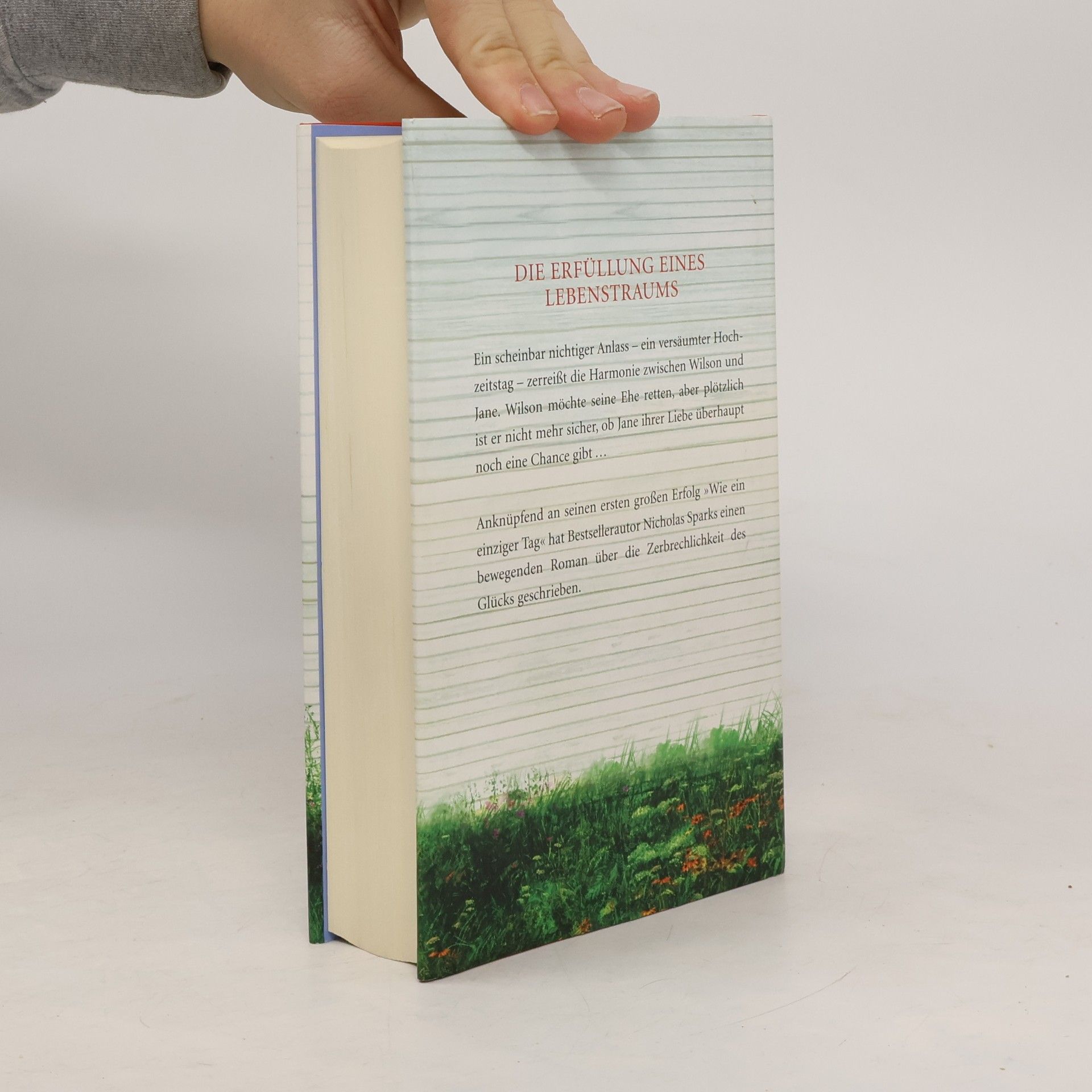 Die Erfüllung eines Lebenstraums Ein scheinbar nichtiger Anlass – ein versäumter Hochzeitstag – zerreißt die Harmonie zwischen Wilson und Jane. Wilson möchte seine Ehe retten – aber plötzlich ist er nicht mehr sicher, ob Jane ihrer Liebe überhaupt noch eine Chance geben will. Anknüpfend an seinen ersten großen Erfolg, „Wie ein einziger Tag“, hat Nicholas Sparks einen bewegenden Roman über die Zerbrechlichkeit des Glücks geschrieben. Seit knapp dreißig Jahren ist Wilson Lewis mit Jane verheiratet. Nach außen ist alles perfekt – mit drei erwachsenen Kindern und einem Haus in dem wunderschönen Städtchen New Bern haben sie sich fast jeden Traum erfüllt. Doch als Wilson ihren 29. Hochzeitstag vergisst, ist Janes Enttäuschung so maßlos, dass Wilson beginnt, an seiner Ehe zu zweifeln. Ist sie noch das, was sie einmal war? Hat er Jane zu sehr vernachlässigt, ihre Liebe für selbstverständlich genommen? Kann Jane ihn, den unromantisch veranlagten, praktisch denkenden Anwalt, überhaupt noch lieben? Wilson sucht Rat bei Janes Vater Noah, dessen einzigartige, fünfzig Jahre währende Liebe zu Allie jedem in ihrer Familie als Vorbild gilt. Bald versteht Wilson, dass er alles tun muss, um Janes Herz zurückzugewinnen. Er wird erneut um sie werben. und sie mit der Erfüllung ihres Lebenstraums überraschen.