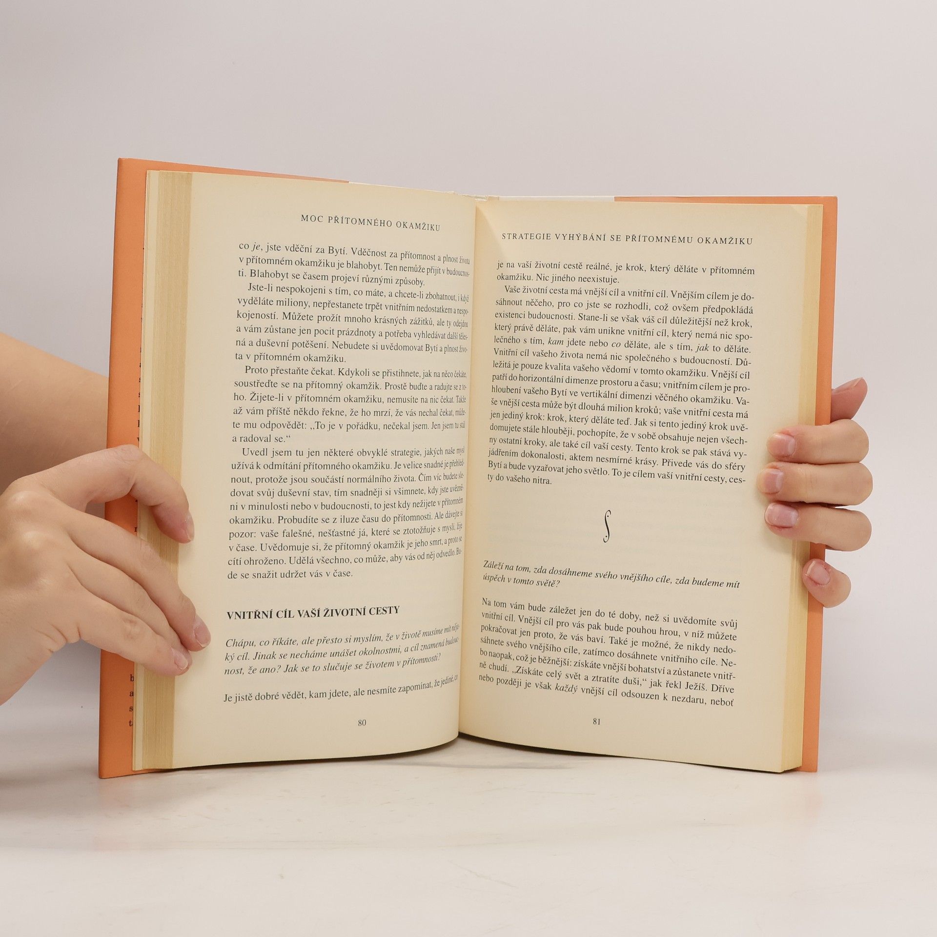 Při čtení této knihy mnoho z nás učiní nové objevy: nejsme svou myslí; můžeme se zbavit duševní bolesti; najdeme, jakmile se vzdáme přítomnému okamžiku. Dovíme se také, že jedním z klíčů k dosažení vnitřního klidu je naše tělo, stejně jako ticho a prostor kolem nás. To jsou brány, jimiž můžeme vstoupit do přítomnosti, kde neexistují žádné problémy. V přítomném okamžiku najdeme své skutečné já a hlubokou vnitřní radost. Pouze v přítomném okamžiku si uvědomíme, že už jsme úplní a dokonalí. Mnoho z nás zjistí, že naší největší překážkou na cestě k tomuto poznání jsou naše partnerské vztahy. Vstupujeme do ,,nového teritoria" a nic není takové, jak se nám to dosud jevilo. Pochopíme, že naše partnerské vztahy mohou být další branou k duchovnímu osvícení, pokud jich budeme užívat moudře, to jest k tomu, abychom se stali víc milujícími. Výsledek? Skutečné spojení mezi naším já a druhými lidmi. Naučíme-li se žít v přítomném okamžiku, budeme-li vnímat realitu ,,neviditelného Bytí" a svého ,,vnitřního těla", otevřeme se transformujícímu poznání, jež nám poskytuje tato kniha.