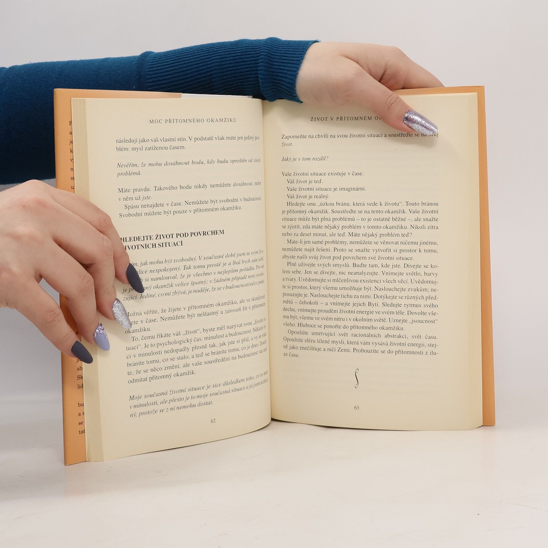Při čtení této knihy mnoho z nás učiní nové objevy: nejsme svou myslí; můžeme se zbavit duševní bolesti; najdeme, jakmile se vzdáme přítomnému okamžiku. Dovíme se také, že jedním z klíčů k dosažení vnitřního klidu je naše tělo, stejně jako ticho a prostor kolem nás. To jsou brány, jimiž můžeme vstoupit do přítomnosti, kde neexistují žádné problémy. V přítomném okamžiku najdeme své skutečné já a hlubokou vnitřní radost. Pouze v přítomném okamžiku si uvědomíme, že už jsme úplní a dokonalí. Mnoho z nás zjistí, že naší největší překážkou na cestě k tomuto poznání jsou naše partnerské vztahy. Vstupujeme do ,,nového teritoria" a nic není takové, jak se nám to dosud jevilo. Pochopíme, že naše partnerské vztahy mohou být další branou k duchovnímu osvícení, pokud jich budeme užívat moudře, to jest k tomu, abychom se stali víc milujícími. Výsledek? Skutečné spojení mezi naším já a druhými lidmi. Naučíme-li se žít v přítomném okamžiku, budeme-li vnímat realitu ,,neviditelného Bytí" a svého ,,vnitřního těla", otevřeme se transformujícímu poznání, jež nám poskytuje tato kniha.