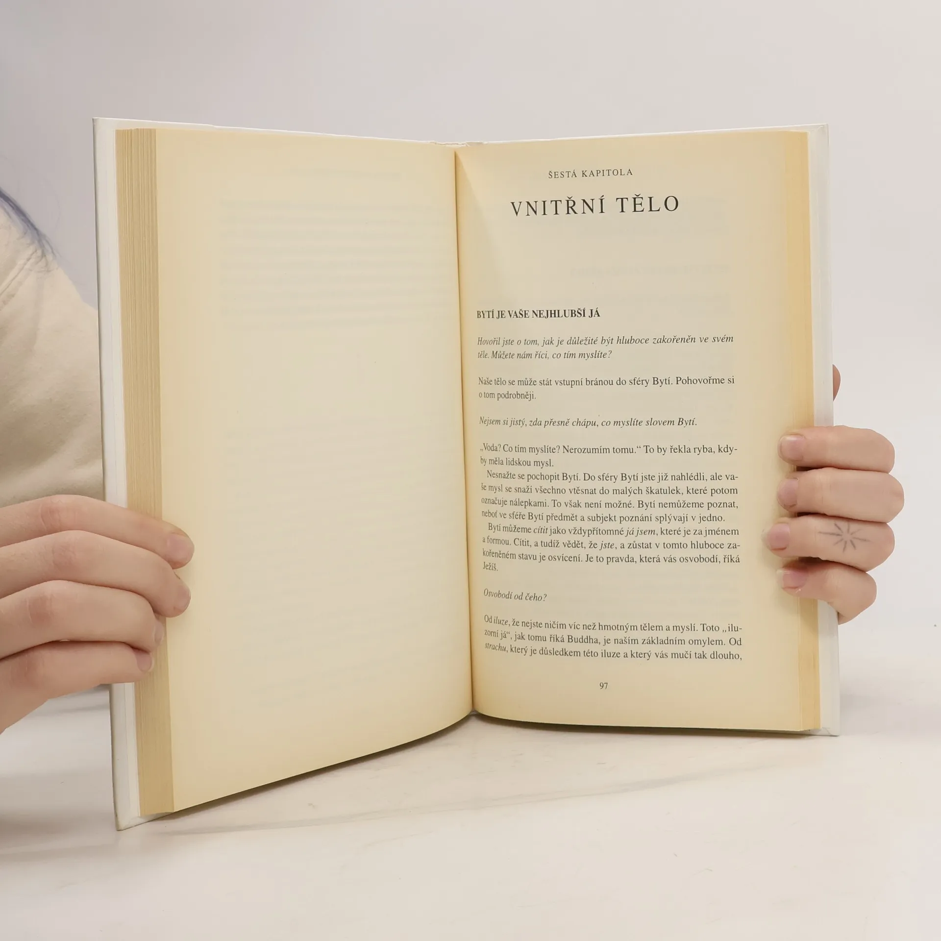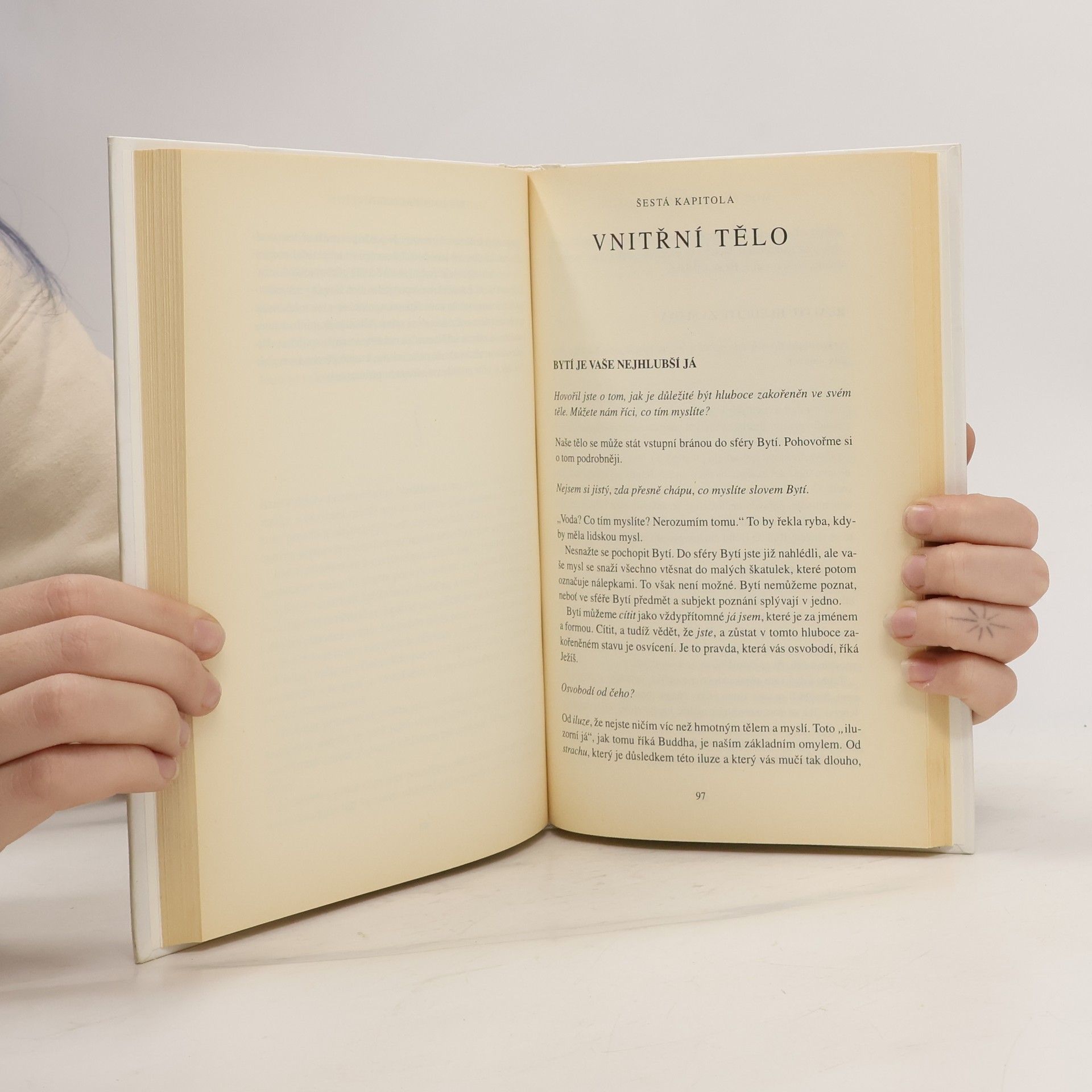 Při čtení této knihy mnoho z nás učiní nové objevy: nejsme svou myslí; můžeme se zbavit duševní bolesti; najdeme, jakmile se vzdáme přítomnému okamžiku. Dovíme se také, že jedním z klíčů k dosažení vnitřního klidu je naše tělo, stejně jako ticho a prostor kolem nás. To jsou brány, jimiž můžeme vstoupit do přítomnosti, kde neexistují žádné problémy. V přítomném okamžiku najdeme své skutečné já a hlubokou vnitřní radost. Pouze v přítomném okamžiku si uvědomíme, že už jsme úplní a dokonalí. Mnoho z nás zjistí, že naší největší překážkou na cestě k tomuto poznání jsou naše partnerské vztahy. Vstupujeme do ,,nového teritoria" a nic není takové, jak se nám to dosud jevilo. Pochopíme, že naše partnerské vztahy mohou být další branou k duchovnímu osvícení, pokud jich budeme užívat moudře, to jest k tomu, abychom se stali víc milujícími. Výsledek? Skutečné spojení mezi naším já a druhými lidmi. Naučíme-li se žít v přítomném okamžiku, budeme-li vnímat realitu ,,neviditelného Bytí" a svého ,,vnitřního těla", otevřeme se transformujícímu poznání, jež nám poskytuje tato kniha.