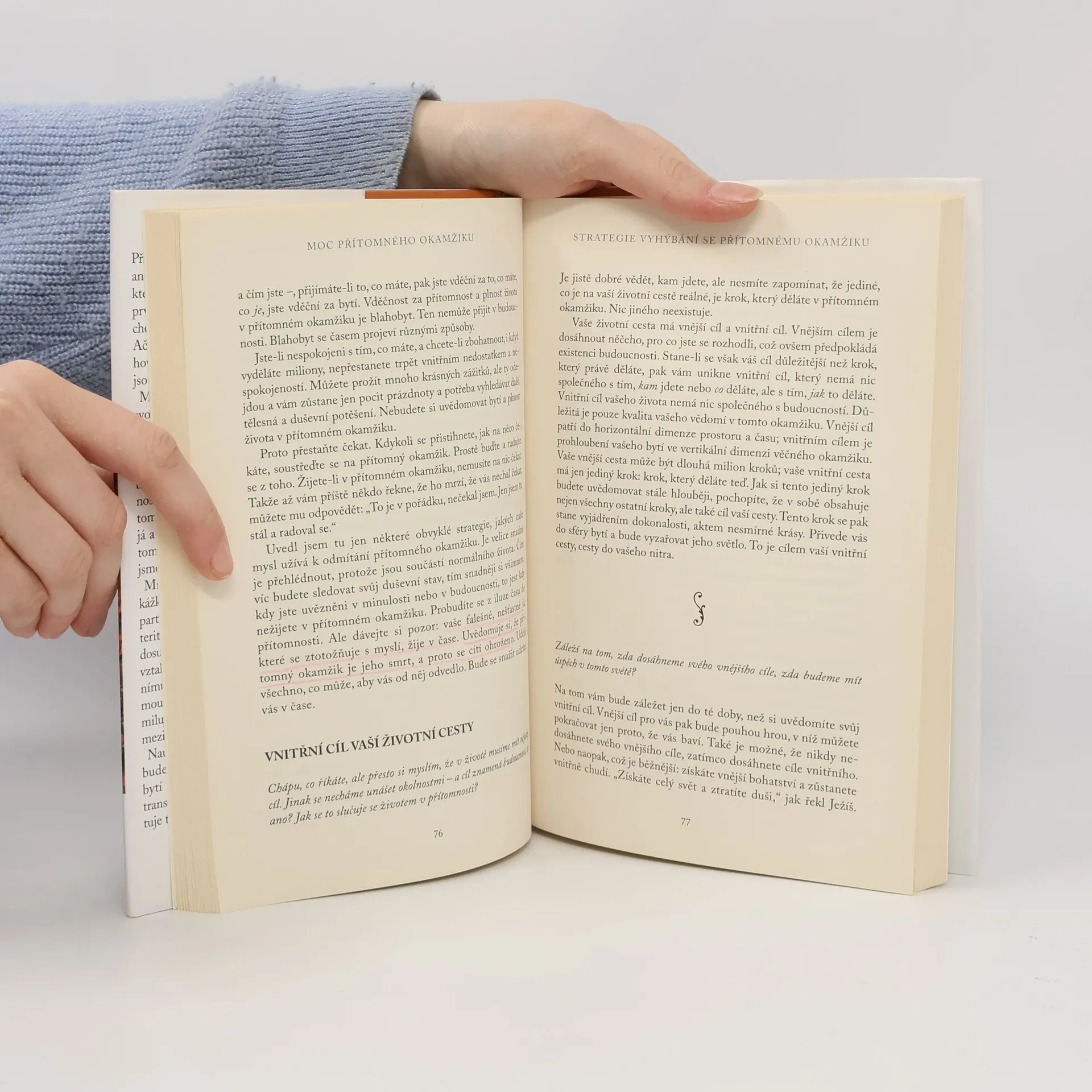 Žít v přítomném okamžiku je podle Eckharta Tolleho pravá cesta ke štěstí. Nemá smysl trápit se minulostí a vynakládat úsilí vzhledem k budoucnu, když opravdový život se odehrává právě nyní a pouze teď s ním můžete něco udělat. Tato slavná kniha promlouvá od svého vzniku k milionům čtenářů, kteří v ní nachází vnitřní mír a souznění se sebou samými.