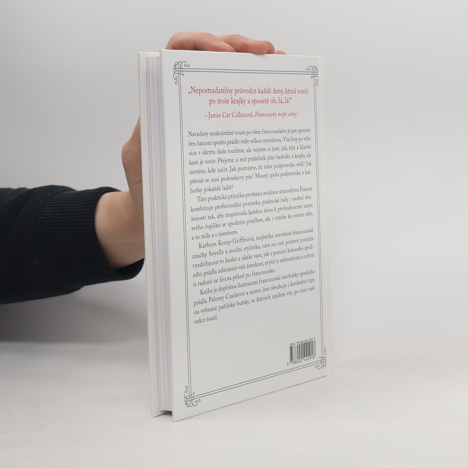 Navzdory nezlomné touze po všem francouzském je pro spoustu žen luxusní spodní prádlo stále velkou neznámou. Všechny po něm sice v skrytu duše toužíme, ale nejsme si jisté, jak, kdy a hlavně kam je nosit. Přejeme si mít prádelník plný hedvábí a krajky, ale nevíme, kde začít. Jak poznáme, že nám podprsenka sedí? Jak přesně se nosí podvazkový pás? Musejí spolu podprsenka a kalhotky pokaždé ladit? Tato praktická příručka protkaná svůdnou atmosférou Francie kombinuje profesionální poznatky, praktické rady i osobní zkušenosti tak, aby inspirovala každou ženu k přehodnocení nejen svého šuplíku se spodním prádlem, ale i vztahu ke svému tělu, a to mile a s úsměvem. Kathryn Kemp-Griffinová, majitelka zavedené francouzské značky Soyelle a módní stylistka, vám na vaší postavě pomůže vyzdvihnout to hezké a ukáže vám, jak s pomocí krásného spodního prádla zdůraznit vaši ženskost, zvýšit si sebevědomí a užívat si radosti ze života pěkně po francouzsku. Kniha je doplněna ilustracemi francouzské návrhářky spodního prádla Palomy Casile a mimo jiné obsahuje i konkrétní tipy na vybrané pařížské butiky, ve kterých najdete vše, po čem vaše srdce touží.