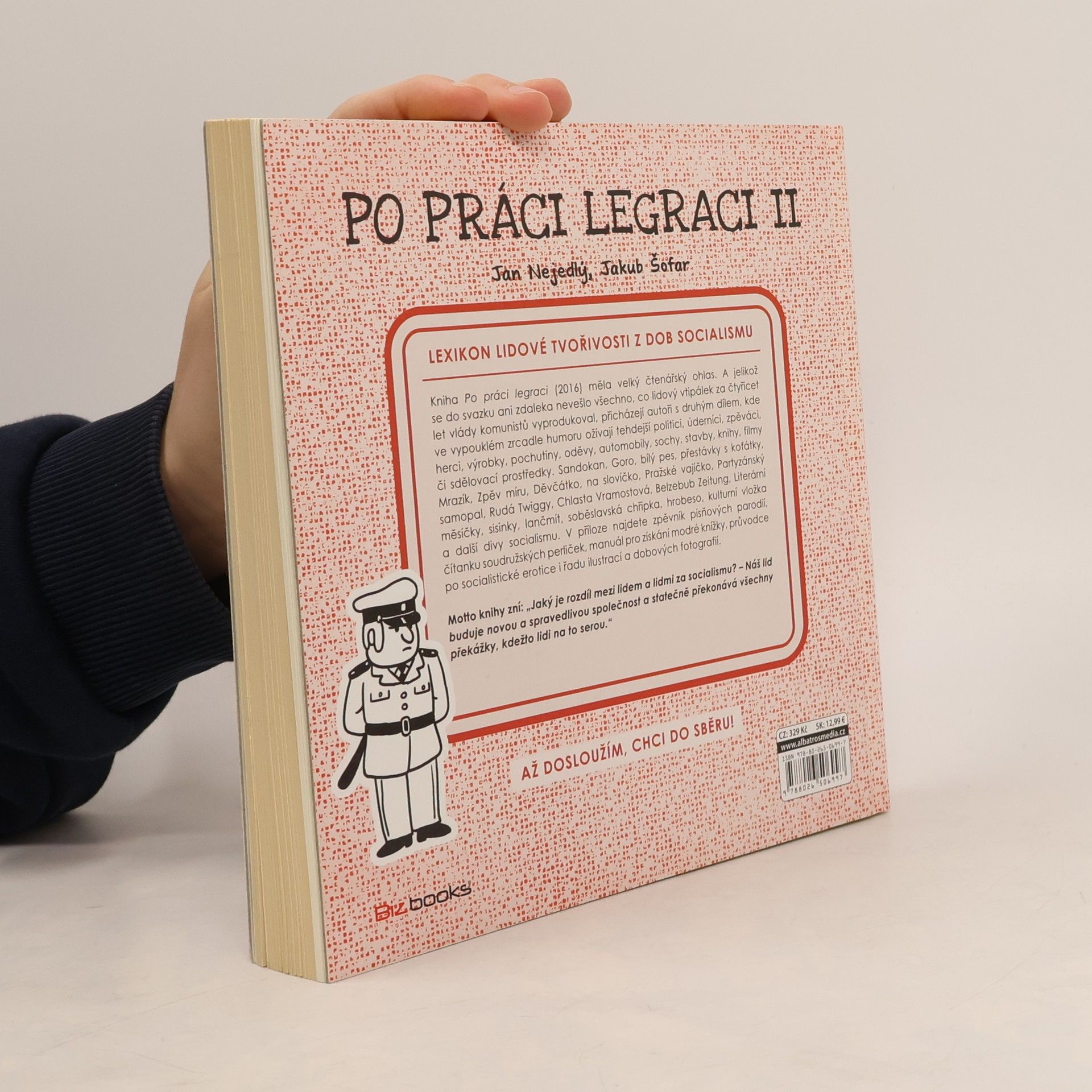 Kniha Po práci legraci (2016) měla velký čtenářský ohlas. Připomenout si dobu socialismu na tehdejších anekdotách, hádankách, parodiích a posměšcích, jež byly pro mladší ročníky opatřeny vysvětlujícím komentářem, se ukázalo jako šťastný nápad. A jelikož se do knihy ani zdaleka nevešlo všechno, co lidový vtipálek za čtyřicet let vlády komunistů vyprodukoval, přicházejí autoři s druhým dílem, kde ve vypouklém zrcadle humoru ožívají tehdejší politici, úderníci, zpěváci, herci, výrobky, pochutiny, oděvy, automobily, sochy, stavby, knihy, filmy či sdělovací prostředky. Sandokan, Goro, bílý pes, přestávky s koťátky, Mrazík, Zpěv míru, Děvčátko, na slovíčko, Pražské vajíčko, Partyzánský samopal, Rudá Twiggy, Chlasta Vramostová, Belzebub Zeitung, Literární měsíčky, sisinky, lančmít, soběslavská chřipka, hrobeso, kulturní vložka a další divy socialismu. V příloze najdete zpěvník písňových parodií, slovníček lidových průpovídek, čítanku soudružských perliček, rukověť mladého rockera a nevojáka i řadu ilustrací a dobových fotografií. Motto knihy zní: „Jaký je rozdíl mezi lidem a lidmi za socialismu? – Náš lid buduje novou a spravedlivou společnost a statečně překonává všechny překážky, kdežto lidi na to serou.“