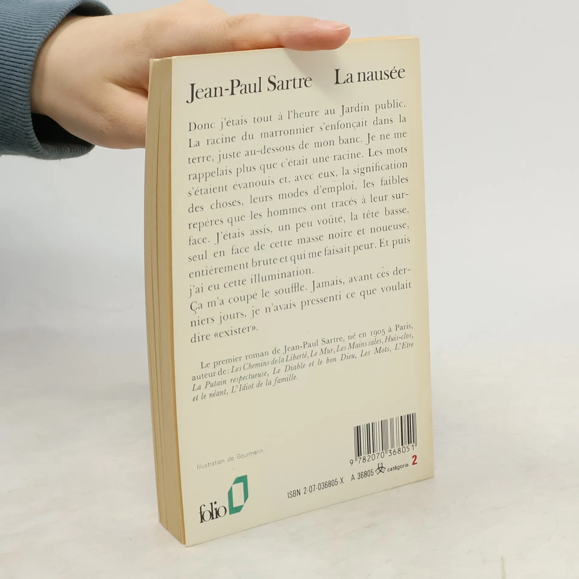 «Donc j'étais tout à l'heure au Jardin public. La racine du marronnier s'enfonçait dans la terre, juste au-dessous de mon banc. Je ne me rappelais plus que c'était une racine. Les mots s'étaient évanouis et, avec eux, la signification des choses, leurs modes d'emploi, les faibles repères que les hommes ont tracés à leur surface. J'étais assis, un peu voûté, la tête basse, seul en face de cette masse noire et noueuse entièrement brute et qui me faisait peur. Et puis j'ai eu cette illumination.Ça m'a coupé le souffle. Jamais, avant ces derniers jours, je n'avais pressenti ce que voulait dire "exister"».