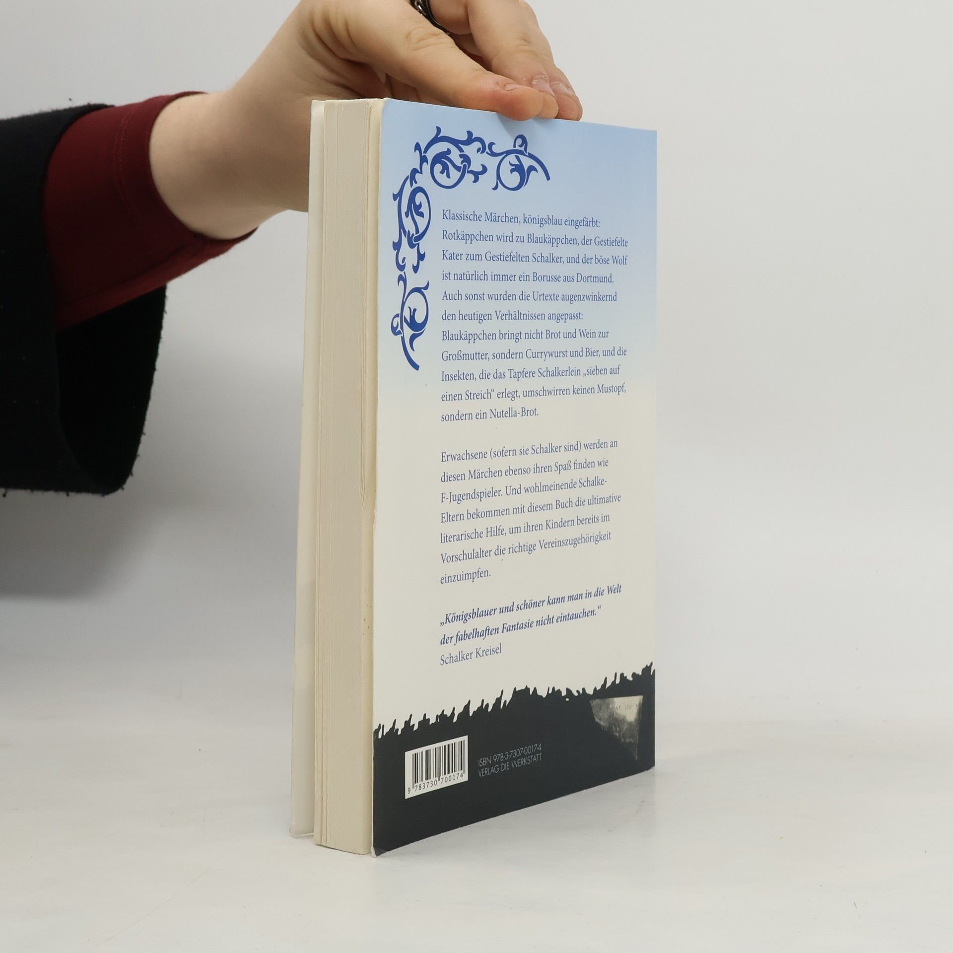 Wohlmeinende Väter scheuen keine pädagogischen Mühen, ihren Blagen bereits im Vorschulalter die richtige Vereinszugehörigkeit einzuimpfen. Dafür gibt es nun die ultimative literarische Hilfe, jedenfalls für Anhänger von Schalke 04: Grimms Märchen, leicht abgewandelt. Da wird Rotkäppchen (den Schalker Vereinsfarbenangepasst) zu Blaukäppchen, der Gestiefelte Kater wird, logo, zum Gestiefelten Schalker, und der böse Wolf ist natürlich immer ein Borusse aus Dortmund. Auch sonst wurden Grimms Urtexte augenzwinkernd den heutigen Verhältnissen angepasst: Blaukäppchen bringt nicht Brot und Wein zur Großmutter, sondern Currywurst und Bier, und die Insekten, die das Tapfere Schalkerlein 'sieben auf einen Streich' erlegt, umschwirren keinen Mustopf, sondern ein Nutella-Brot. Bei all dem wird man das Gefühl nicht los: Erwachsene werden an diesen Geschichten mindestens ebenso ihren Spaß haben wie die F-Jugend.