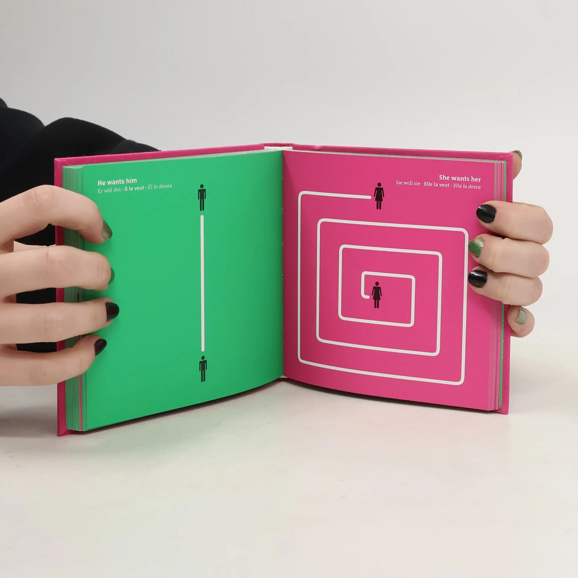 In diesem Band ihrer cleveren Piktogramm-Reihe nimmt sich Grafikerin Yang Liu eines der heikelsten und ältesten Themen der Menschheit an: dem Verhältnis der Geschlechter – zwischen Mann und Frau, Yang und Yin, Adam und Eva, Mars und Venus, ihm und ihr. Sie meinen, das kennen Sie alles schon? Nicht so, wie Yang Liu es darstellt. Aus eigenen Erfahrungen und mit großer Akribie durchgeführten Beobachtungen schöpfend , findet Yang Liu für das traditionell mit Fettnäpfchen übersäte Feld der Genderfragen eine eingängige und prägnante Bildersprache. Scheinbar schlicht und plakativ, beschwören ihre Entwürfe doch unendlich viele Assoziationen herauf. Durch das augenzwinkernde Übertragen von uralten Stereotypen auf aktuelle Situationen erlaubt uns die Künstlerin einen völlig neuen Blick auf das Verhältnis von Mann und Frau.