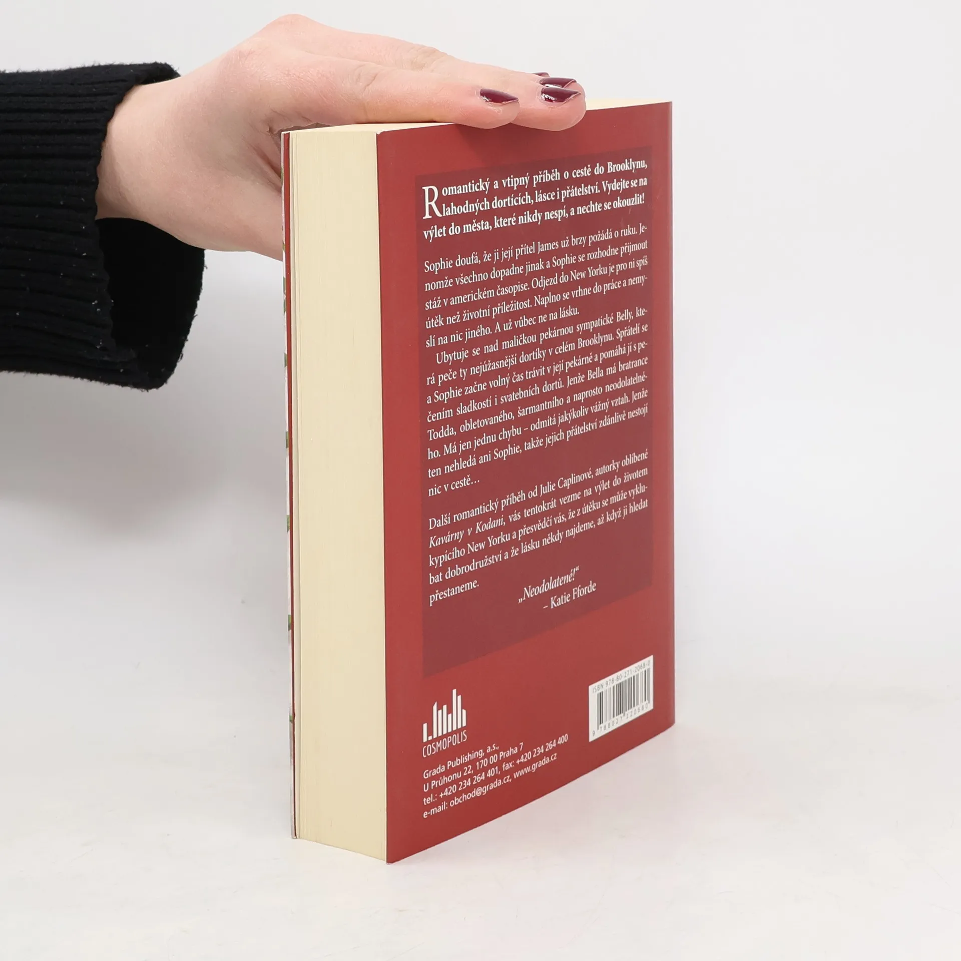 Romantický a vtipný příběh o cestě do Brooklynu, lahodných dortících, lásce i přátelství. Vydejte se na výlet do města, které nikdy nespí, a nechte se okouzlit! Sophie doufá, že ji její přítel James už brzy požádá o ruku. Jenomže všechno dopadne jinak a Sophie se rozhodne přijmout stáž v americkém časopise. Odjezd do New Yorku je pro ni spíš útěk než životní příležitost. Naplno se vrhne do práce a nemyslí na nic jiného. A už vůbec ne na lásku. Ubytuje se nad maličkou pekárnou sympatické Belly, která peče ty nejúžasnější dortíky v celém Brooklynu. Spřátelí se a Sophie začne volný čas trávit v její pekárně a pomáhá jí s pečením sladkostí i svatebních dortů. Jenže Bella má bratrance Todda, obletovaného, šarmantního a naprosto neodolatelného. Má jen jednu chybu – odmítá jakýkoliv vážný vztah. Jenže ten nehledá ani Sophie, takže jejich přátelství zdánlivě nestojí nic v cestě… Další romantický příběh od Julie Caplinové, autorky oblíbené Kavárny v Kodani, vás tentokrát vezme na výlet do životem kypícího New Yorku a přesvědčí vás, že z útěku se může vyklubat dobrodružství a že lásku někdy najdeme, až když ji hledat přestaneme.