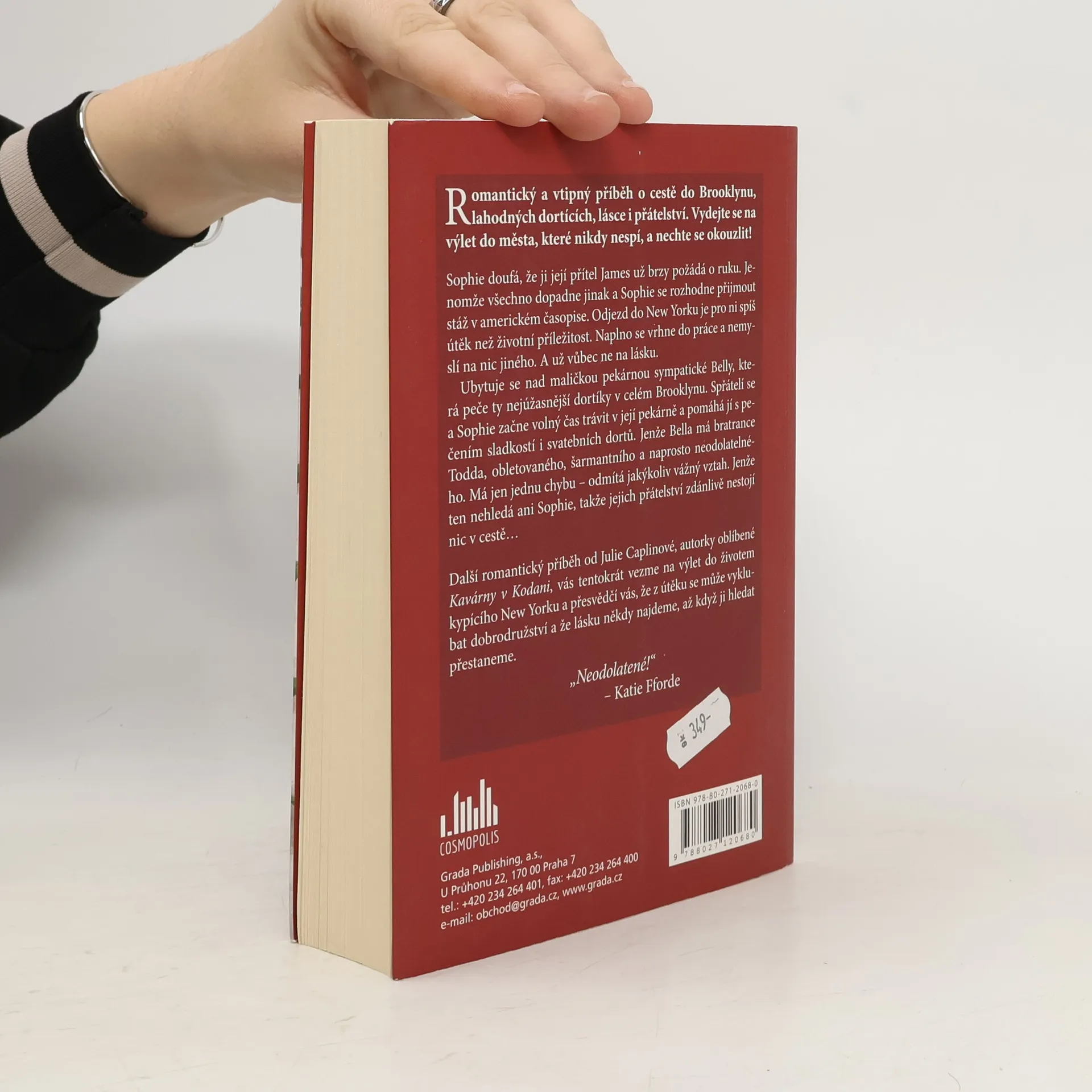 Romantický a vtipný příběh o cestě do Brooklynu, lahodných dortících, lásce i přátelství. Vydejte se na výlet do města, které nikdy nespí, a nechte se okouzlit! Sophie doufá, že ji její přítel James už brzy požádá o ruku. Jenomže všechno dopadne jinak a Sophie se rozhodne přijmout stáž v americkém časopise. Odjezd do New Yorku je pro ni spíš útěk než životní příležitost. Naplno se vrhne do práce a nemyslí na nic jiného. A už vůbec ne na lásku. Ubytuje se nad maličkou pekárnou sympatické Belly, která peče ty nejúžasnější dortíky v celém Brooklynu. Spřátelí se a Sophie začne volný čas trávit v její pekárně a pomáhá jí s pečením sladkostí i svatebních dortů. Jenže Bella má bratrance Todda, obletovaného, šarmantního a naprosto neodolatelného. Má jen jednu chybu – odmítá jakýkoliv vážný vztah. Jenže ten nehledá ani Sophie, takže jejich přátelství zdánlivě nestojí nic v cestě… Další romantický příběh od Julie Caplinové, autorky oblíbené Kavárny v Kodani, vás tentokrát vezme na výlet do životem kypícího New Yorku a přesvědčí vás, že z útěku se může vyklubat dobrodružství a že lásku někdy najdeme, až když ji hledat přestaneme.