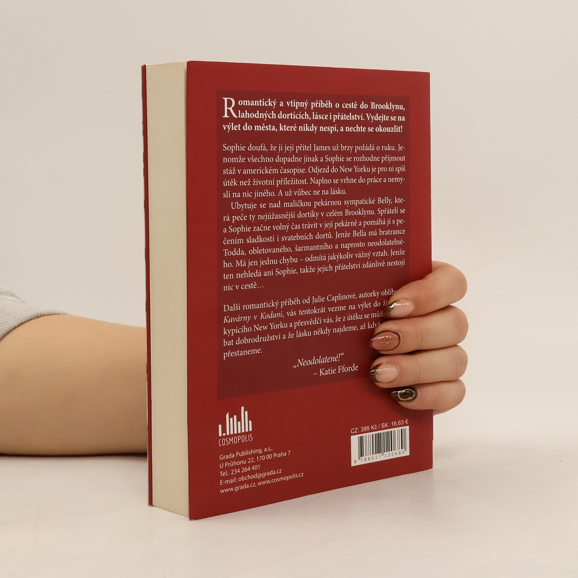 Romantický a vtipný příběh o cestě do Brooklynu, lahodných dortících, lásce i přátelství. Vydejte se na výlet do města, které nikdy nespí, a nechte se okouzlit! Sophie doufá, že ji její přítel James už brzy požádá o ruku. Jenomže všechno dopadne jinak a Sophie se rozhodne přijmout stáž v americkém časopise. Odjezd do New Yorku je pro ni spíš útěk než životní příležitost. Naplno se vrhne do práce a nemyslí na nic jiného. A už vůbec ne na lásku. Ubytuje se nad maličkou pekárnou sympatické Belly, která peče ty nejúžasnější dortíky v celém Brooklynu. Spřátelí se a Sophie začne volný čas trávit v její pekárně a pomáhá jí s pečením sladkostí i svatebních dortů. Jenže Bella má bratrance Todda, obletovaného, šarmantního a naprosto neodolatelného. Má jen jednu chybu – odmítá jakýkoliv vážný vztah. Jenže ten nehledá ani Sophie, takže jejich přátelství zdánlivě nestojí nic v cestě… Další romantický příběh od Julie Caplinové, autorky oblíbené Kavárny v Kodani, vás tentokrát vezme na výlet do životem kypícího New Yorku a přesvědčí vás, že z útěku se může vyklubat dobrodružství a že lásku někdy najdeme, až když ji hledat přestaneme.