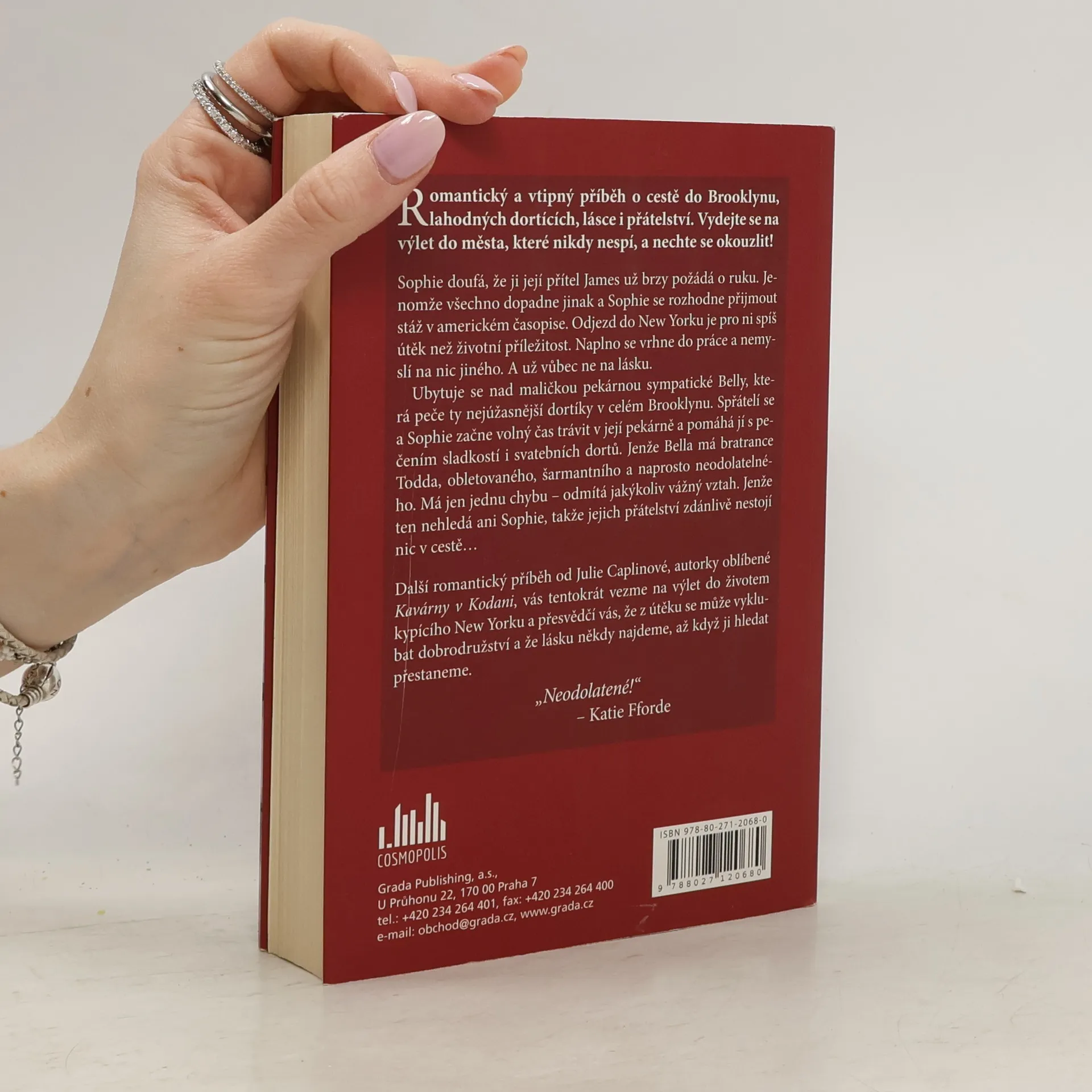 Romantický a vtipný příběh o cestě do Brooklynu, lahodných dortících, lásce i přátelství. Vydejte se na výlet do města, které nikdy nespí, a nechte se okouzlit! Sophie doufá, že ji její přítel James už brzy požádá o ruku. Jenomže všechno dopadne jinak a Sophie se rozhodne přijmout stáž v americkém časopise. Odjezd do New Yorku je pro ni spíš útěk než životní příležitost. Naplno se vrhne do práce a nemyslí na nic jiného. A už vůbec ne na lásku. Ubytuje se nad maličkou pekárnou sympatické Belly, která peče ty nejúžasnější dortíky v celém Brooklynu. Spřátelí se a Sophie začne volný čas trávit v její pekárně a pomáhá jí s pečením sladkostí i svatebních dortů. Jenže Bella má bratrance Todda, obletovaného, šarmantního a naprosto neodolatelného. Má jen jednu chybu – odmítá jakýkoliv vážný vztah. Jenže ten nehledá ani Sophie, takže jejich přátelství zdánlivě nestojí nic v cestě… Další romantický příběh od Julie Caplinové, autorky oblíbené Kavárny v Kodani, vás tentokrát vezme na výlet do životem kypícího New Yorku a přesvědčí vás, že z útěku se může vyklubat dobrodružství a že lásku někdy najdeme, až když ji hledat přestaneme.