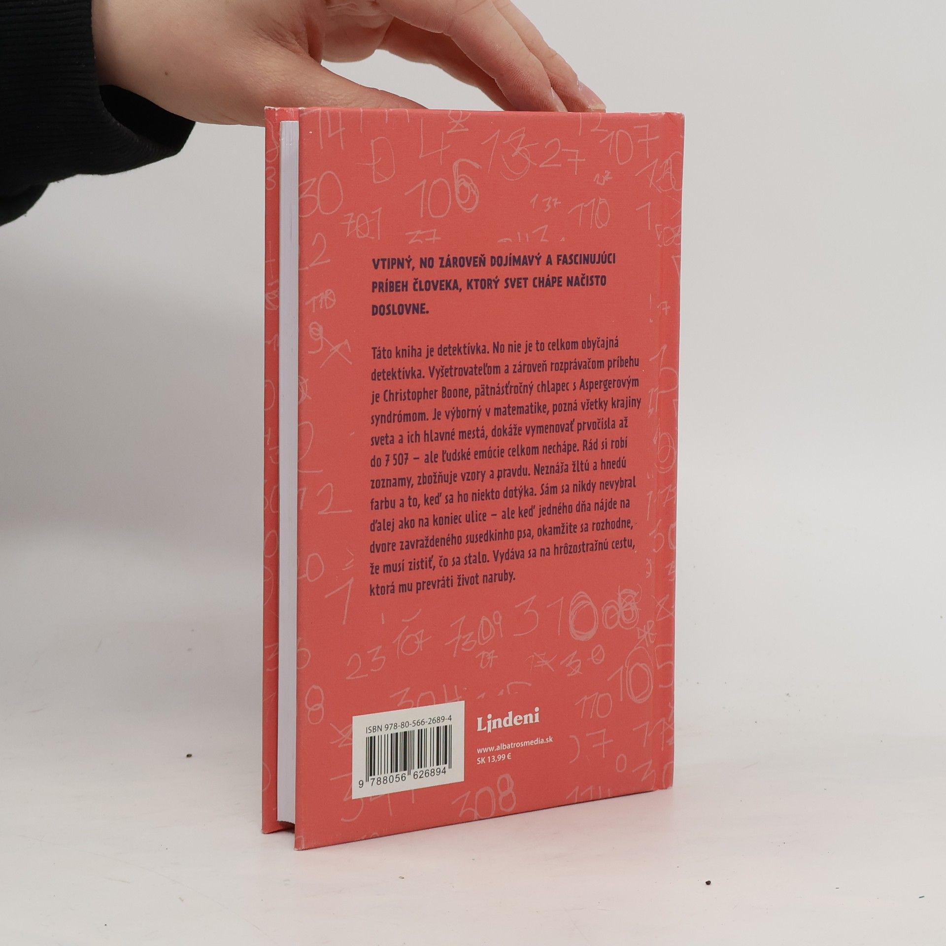 Vtipný, no zároveň dojímavý a fasinujúci príbeh pätnásťročného chlapca s Aspergerovým syndrómom, ktorý jedného dňa nájde na dvore zavraždeného susedkinho psa a rozhodne sa vraha vypátrať na vlastnú päsť… Táto kniha je detektívka. No nie je to celkom obyčajná detektívka. Vyšetrovateľom a zároveň rozprávačom príbehu je Christopher Boone, pätnásťročný chlapec s Aspergerovým syndrómom. Je výborný v matematike, pozná všetky krajiny sveta a ich hlavné mestá, dokáže vymenovať prvočísla až do 7 507 – ale ľudské emócie celkom nechápe. Rád si robí zoznamy, zbožňuje vzory a pravdu. Neznáša žltú a hnedú farbu a to, keď sa ho niekto dotýka. Sám sa nikdy nevybral ďalej ako na koniec ulice – ale keď jedného dňa nájde na dvore zavraždeného susedkinho psa, okamžite sa rozhodne, že musí zistiť, čo sa stalo. Vydáva sa na hrôzostrašnú cestu, ktorá mu prevráti život naruby.