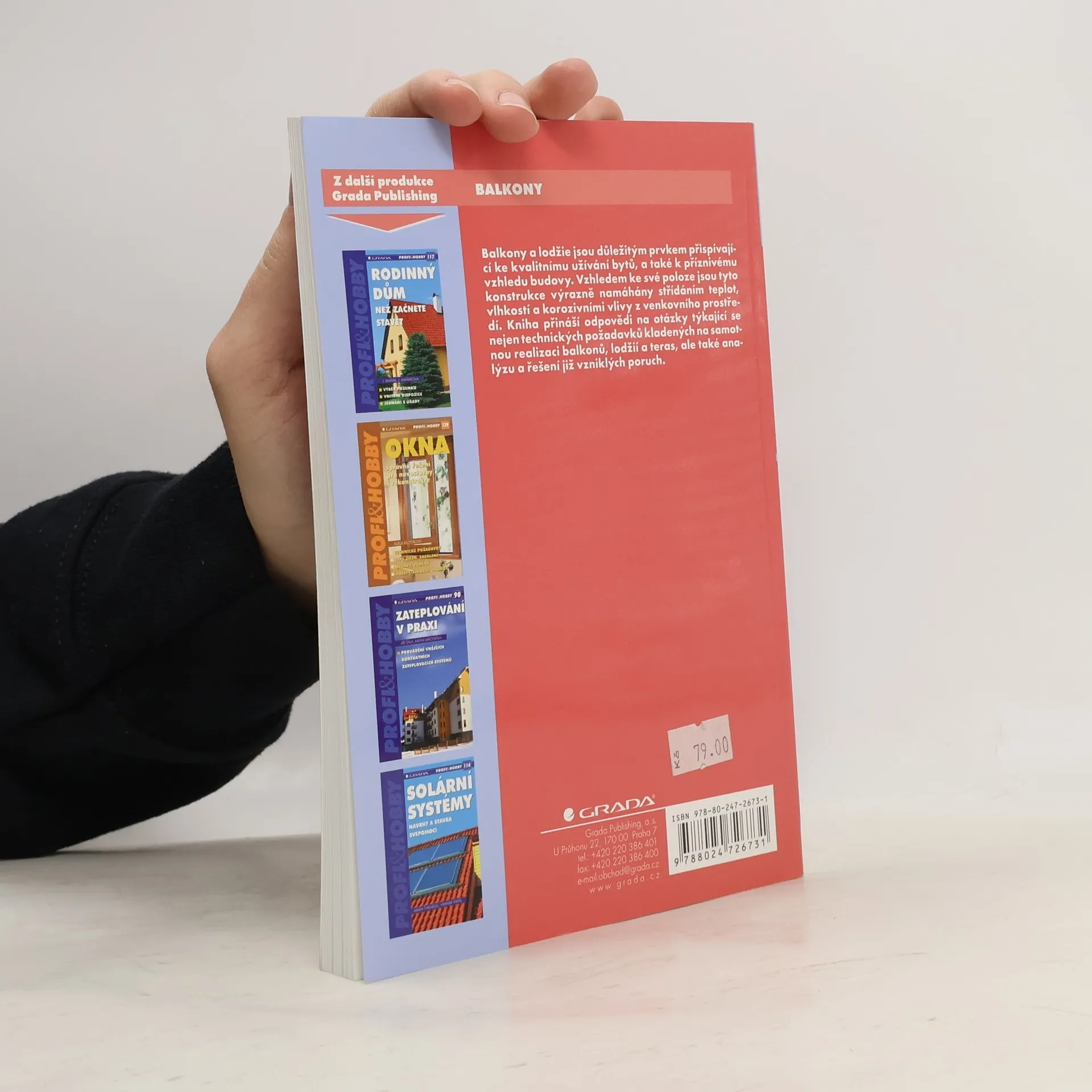 Balkony - opravy balkonů, lodžií a teras. Kniha přináší odpovědi na otázky, týkající se nejen technických požadavků kladených na samotnou realizaci balkonů, lodžií a teras, ale také analýzu a řešení již vzniklých poruch. Značná část publikace je věnována praktickým ukázkám obnovy těchto částí budov za použití nejmodernějších postupů a materiálů. Vzhledem ke své poloze jsou tyto konstrukce výrazně namáhány střídáním teplot, vlhkostí a korozivními vlivy z venkovního prostředí. 1.vydání, přeloženo ze slovenského vydání.
