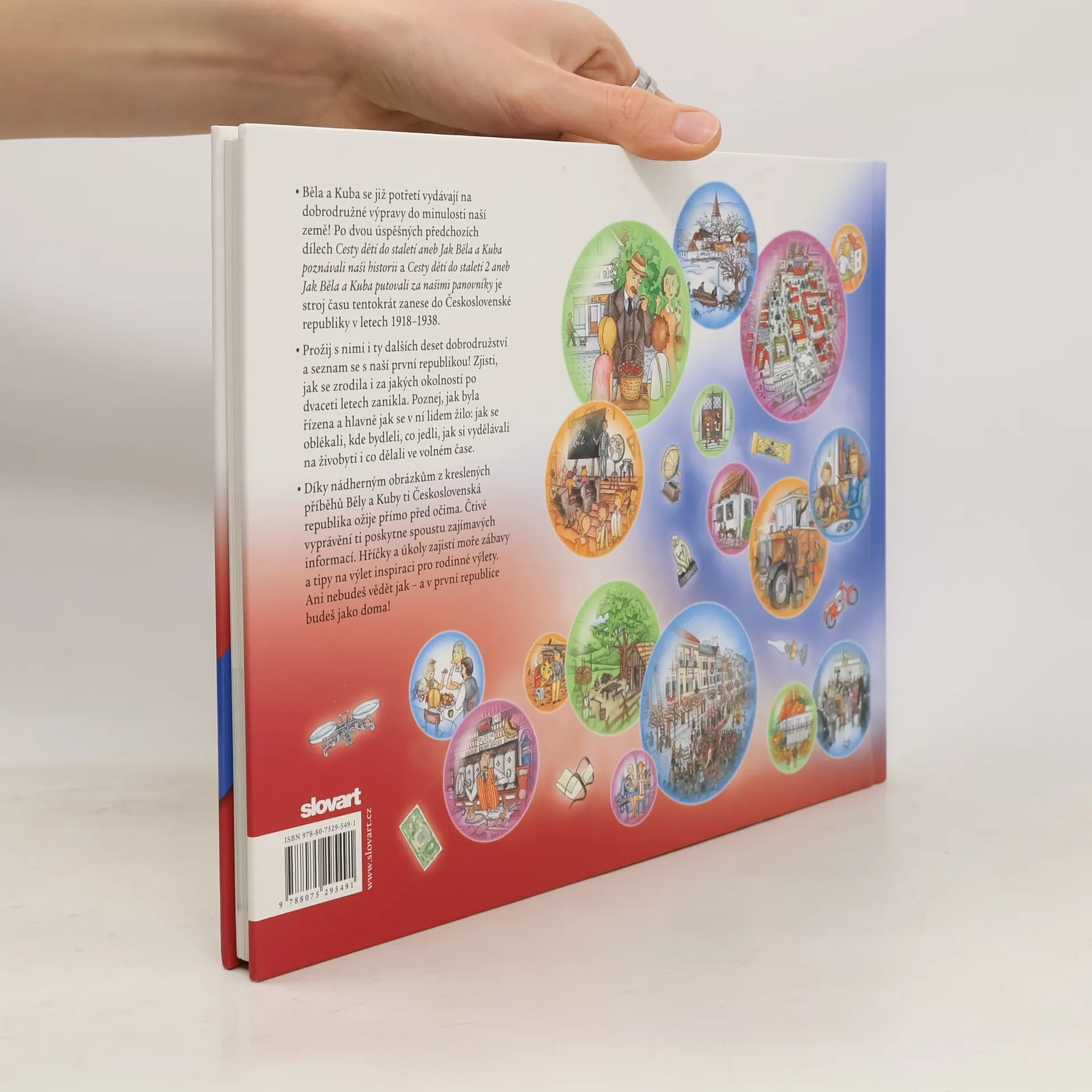 Běla a Kuba se již potřetí vydávají na dobrodružné výpravy do minulosti naší země! Po dvou úspěšných předchozích dílech Cesty dětí do staletí aneb Jak Běla a Kuba poznávali naši historii a Cesty dětí do staletí 2 aneb Jak Běla a Kuba putovali za našimi panovníky je stroj času tentokrát zanesl do Československé republiky v letech 1918 až 1938. Prožij s nimi i ty dalších deset nových dobrodružství a seznam se s naší první republikou, která teď slaví 100. výročí vzniku! Zjisti, jak se zrodila i za jakých okolností po dvaceti letech zanikla. Poznej, jak byla řízena a hlavně jak se v ní lidem žilo: jak se oblékali, kde bydleli, co jedli, jak si vydělávali na živobytí i co dělali ve volném čase. Dozvíš se také, jak se dařilo prvorepublikové kultuře, průmyslu či zemědělství. Díky nádherným obrázkům z kreslených příběhů Běly a Kuby ti Československá republika ožije přímo před očima. Čtivé vyprávění kolem nich ti poskytne spoustu zajímavých informací. Hříčky a úkoly zajistí moře zábavy a tipy na výlet inspiraci pro rodinné výlety. Ani nebudeš vědět jak – a v první republice budeš jako doma!