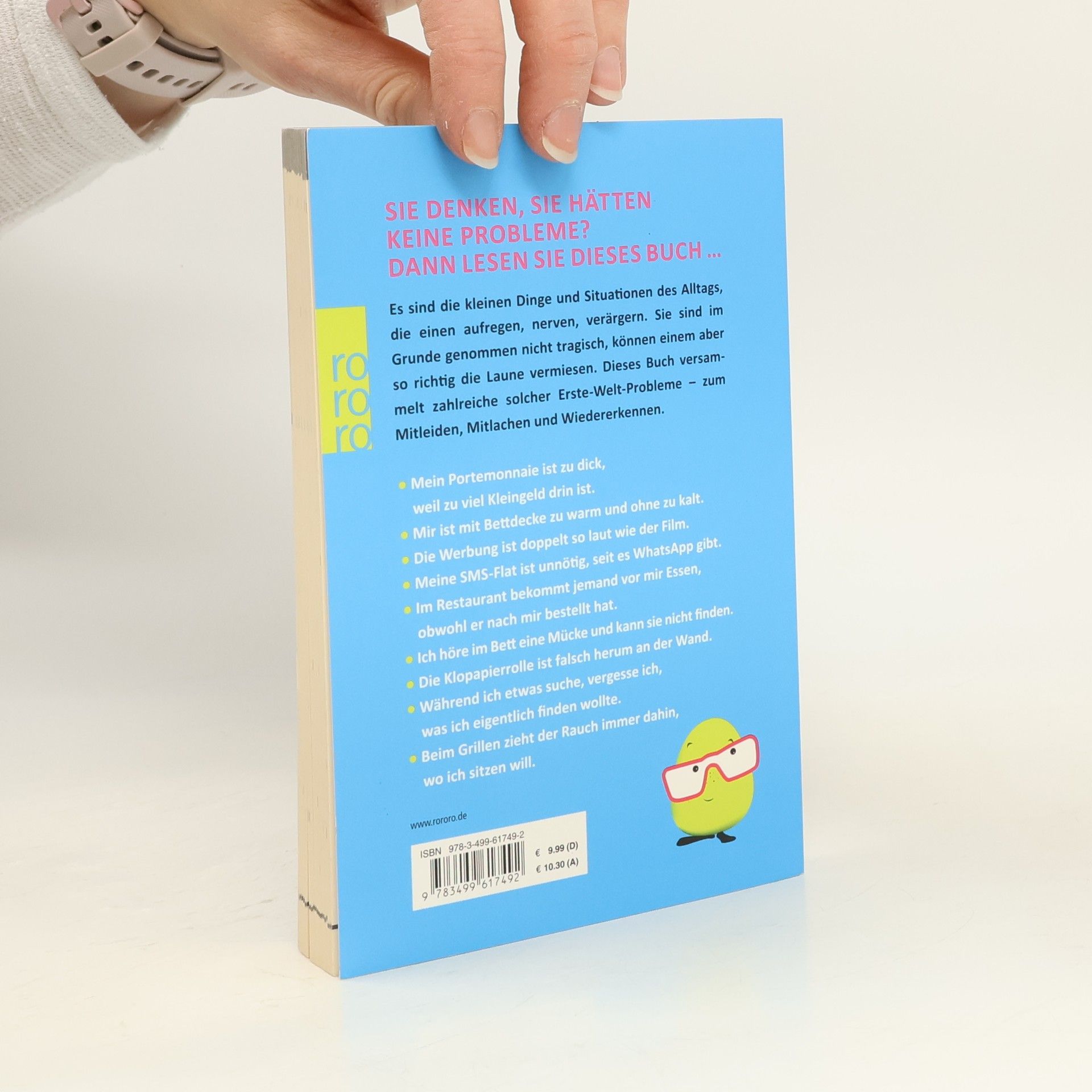 Sie denken, Sie hätten keine Probleme? Dann lesen Sie dieses Buch ... Es sind die kleinen Dinge und Situationen des Alltags, die einen aufregen, nerven, verärgern. Sie sind im Grunde genommen nicht tragisch, können einem aber so richtig die Laune vermiesen. Dieses Buch versammelt zahlreiche solcher Erste-Welt-Probleme - zum Mitleiden, Mitlachen und Wiedererkennen. ; Mein Portemonnaie ist zu dick, weil zu viel Kleingeld drin ist. ; Mir ist mit Bettdecke zu warm und ohne zu kalt. ; Die Werbung ist doppelt so laut wie der Film. ; Meine SMS-Flat ist unnötig, seit es WhatsApp gibt. ; Im Restaurant bekommt jemand vor mir Essen, obwohl er nach mir bestellt hat. ; Ich höre im Bett eine Mücke und kann sie nicht finden. ; Die Klopapierrolle ist falsch herum an der Wand. ; Während ich etwas suche, vergesse ich, was ich eigentlich finden wollte. ; Beim Grillen zieht der Rauch immer dahin, wo ich sitzen will.