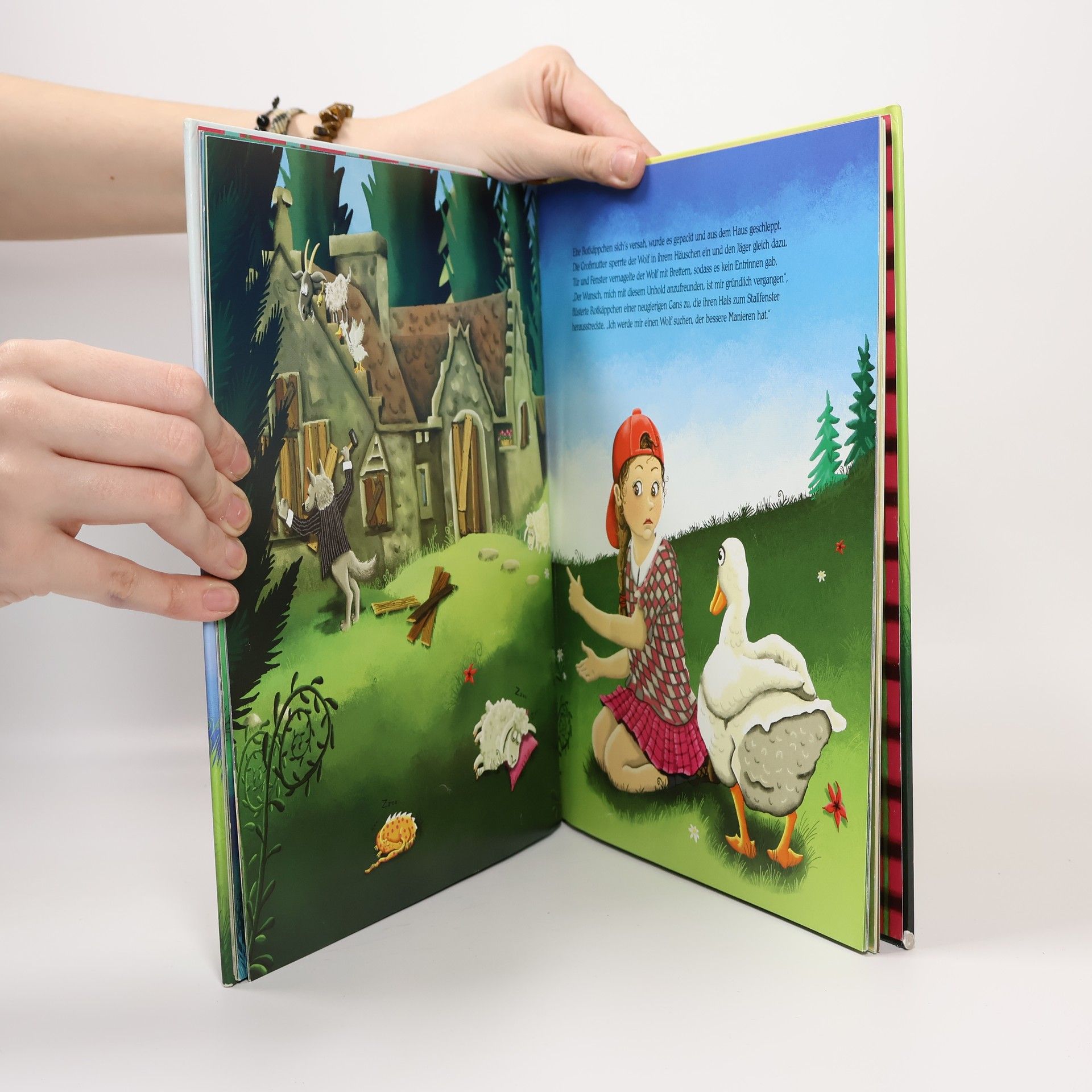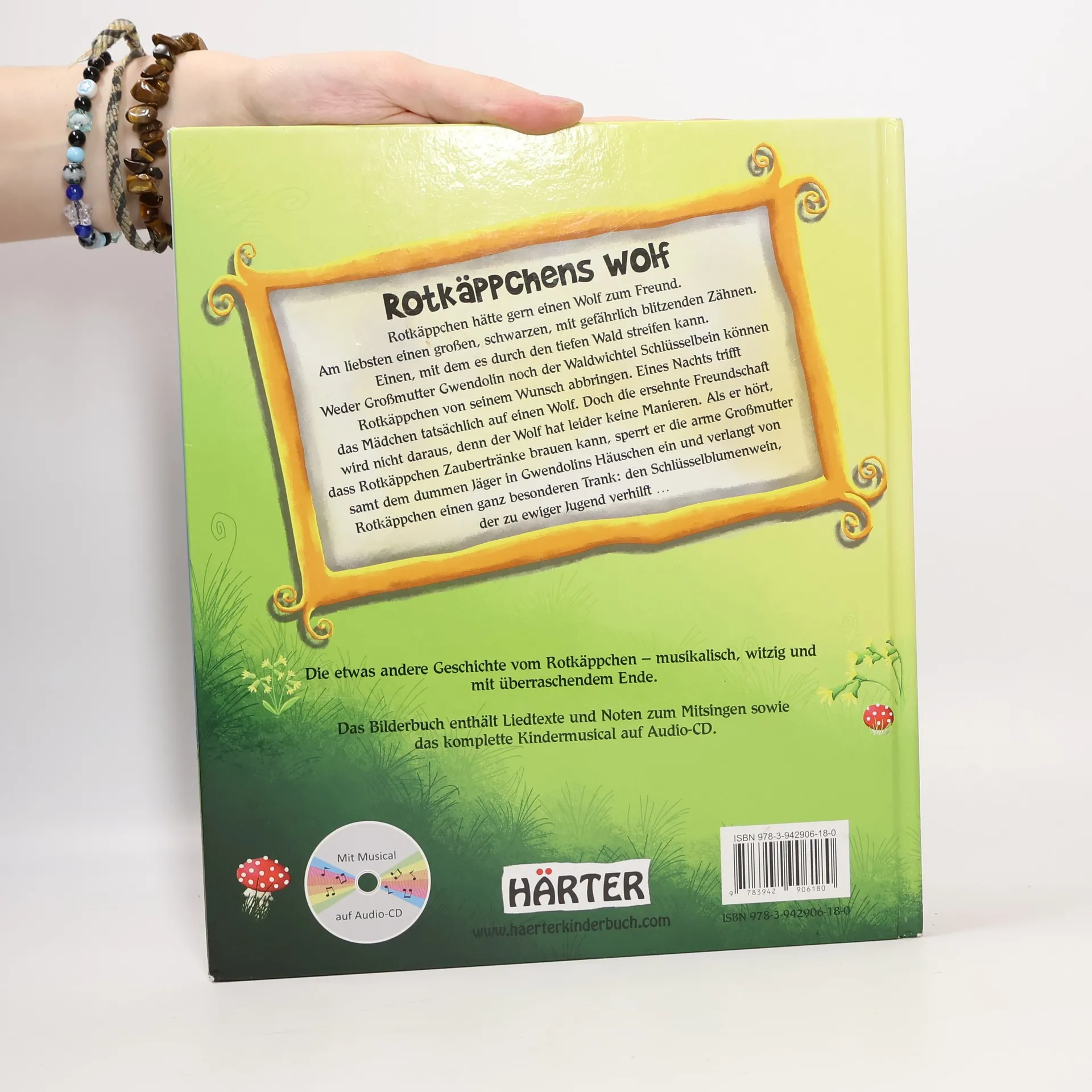 Rotkäppchen (mit rotem Baseball Cap) lebt mit ihrer Grossmutter Gwendolin am Waldesrand. Während Gwendolin die Kunst der Wahrsagerei beherrscht, kann Rotkäppchen Zaubertränke aller Art zubereiten und geht oft in den Wald, um Blumen und Kräuter zu sammeln. Für die Erfüllung ihres gröt︢en Wunsches gibt es aber leider keinen Trank: Sie möchte gerne einen Wolf als Freund. Dummerweise hat der einzige Wolf, dem sie begegnet keine Manieren: Er verlangt von ihr Schlüsselblumenwein, der zu ewiger Jugend verhelfen soll, und nimmt deshalb sogar die Grossmutter und den angeberischen und feigen Jäger als Geiseln. - Nach "Rumpelstilzchens Glück" gibt es jetzt bereits das 4. "Musical-Bilderbuch" nach bewährtem Rezept: freie Anlehnung an ein bekanntes Märchen mit modernisiertem Personal und Geschichte, bunte Illustrationen von T. Donner, eine beiliegende CD mit Hörbuchfassung inklusive Lieder unterschiedlichster Stilrichtungen, die die Geschichte vertiefen und im Anschluss des Bilderbuches finden sich die Liedtexte inklusive Noten zum Mitsingen. Fantasievolle neue Version - wie die Vorgänger empfohlen. Ab 5