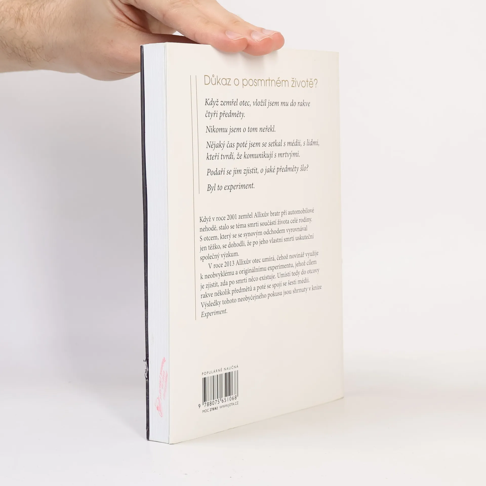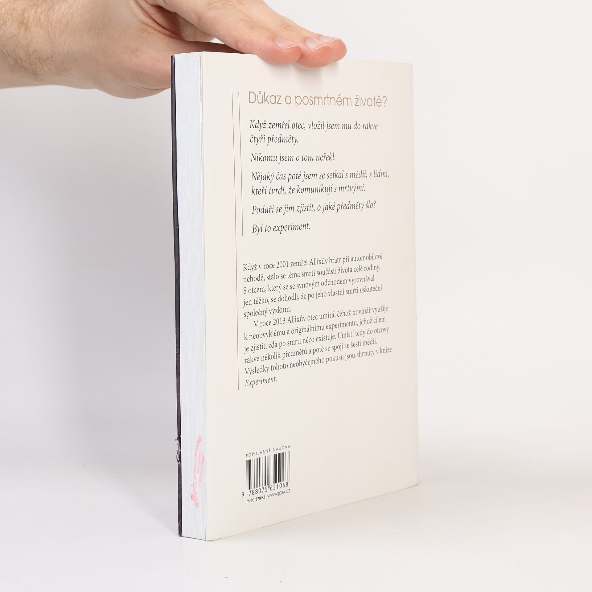 Když zemřel otec, umístil jsem do jeho rakve několik předmětů. Nikomu jsem o tom neřekl. Nějaký čas poté jsem se setkal s médii, s lidmi, kteří tvrdí, že komunikují s mrtvými. Podaří se jim zjistit, o jaké předměty šlo? Byl to experiment. Můžeme komunikovat s mrtvými? Někteří lidé tvrdí, že ano, a dokonce si z této komunikace udělali živnost. Na konzultace k nim přicházejí tisíce lidí. Mají skutečně výjimečné schopnosti, nebo jde o pouhou iluzi? Stéphane Allix hledal odpověď na tyto otázky během setkání se šesti médii. Výsledky jsou ohromující a potvrzují, co už dřív odhalila vědecká bádání na toto téma: posmrtný život je dnes zcela racionální hypotézou. Jak se člověk stane médiem? Je to dar, nebo prokletí? Jak popsat to, co se děje po smrti? Kam odcházíme? Může konzultace u média pomoci při procesu truchlení? Jak se vyhnout šarlatánům? Kniha se věnuje všem zmíněným otázkám a vtahuje nás do reality, která je jednoduchá a přitom závratná: s milovanými bytostmi, které nás opustily, můžeme komunikovat i po smrti.