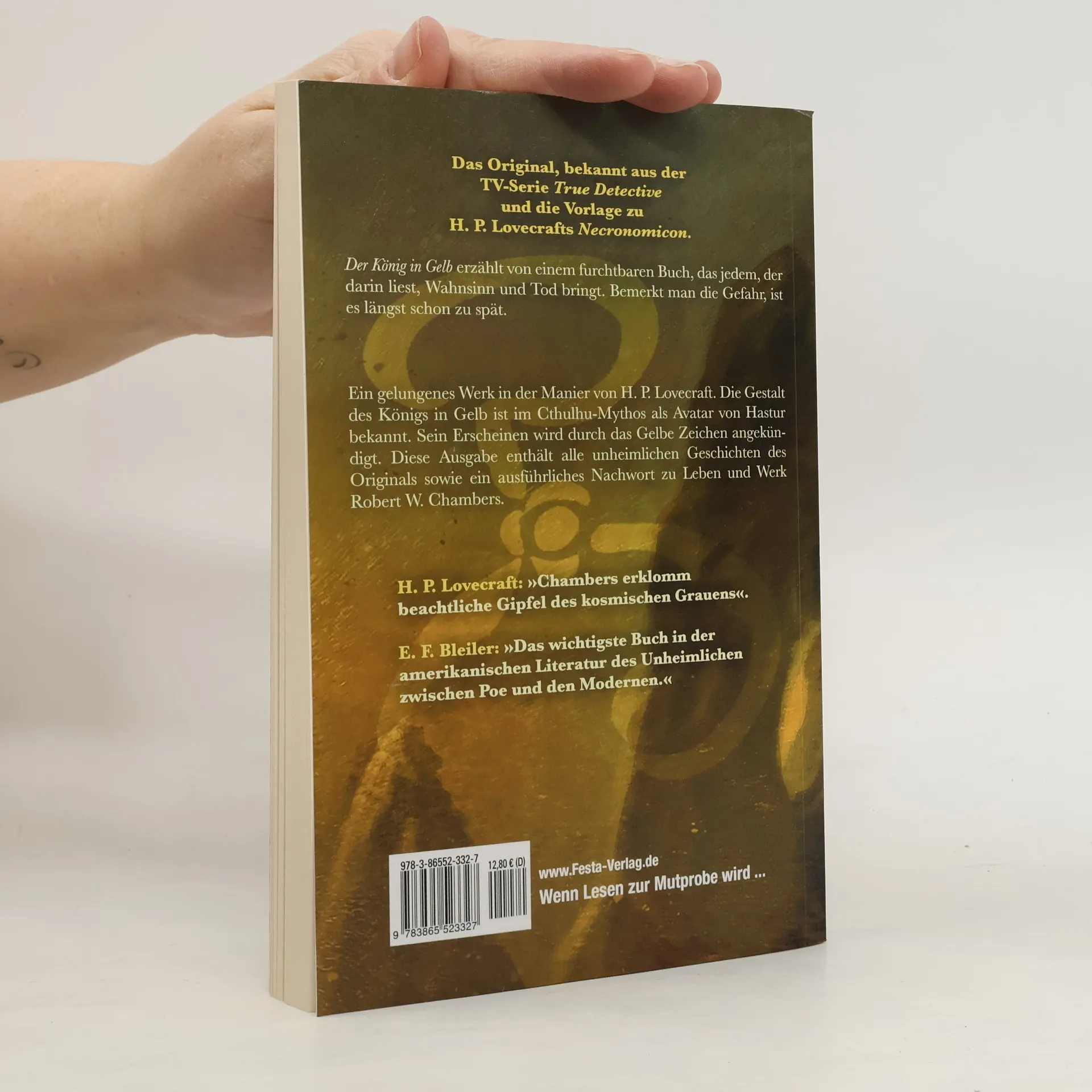 Das Original, bekannt aus der TV-Serie True Detective und die Vorlage zu H. P. Lovecrafts Necronomicon.§§Der König in Gelb erzählt von einem furchtbaren Buch, das jedem, der darin liest, Wahnsinn und Tod bringt. Bemerkt man die Gefahr, ist es längst schon zu spät.§§Inhalt: Cassildas Lied - Der Wiederhersteller des guten Rufes - Die Maske - Am Hofe des Drachen - Das Gelbe Zeichen - Die Jungfer d'Ys - Das Paradies der Propheten - Die Straße der Vier Winde - Nachwort von Michael Nagula: Robert W. Chambers: Fantast zwischen Poesie und Dekadenz & Die Bücher des Robert W. Chambers§§H. P. Lovecraft: 'Chambers erklomm beachtliche Gipfel des kosmischen Grauens'.§§E. F. Bleiler: 'Das wichtigste Buch in der amerikanischen Literatur des Unheimlichen zwischen Poe und den Modernen.'§§Ein gelungenes Werk in der Manier von H. P. Lovecraft. Die Gestalt des Königs in Gelb ist im Cthulhu-Mythos als Avatar von Hastur bekannt. Sein Erscheinen wird durch das Gelbe Zeichen angekündigt. Diese Ausgabe enthält alle unheimlichen Geschichten des Originals sowie ein ausführliches Nachwort zu Leben und Werk Robert W. Chambers (1865 - 1933)