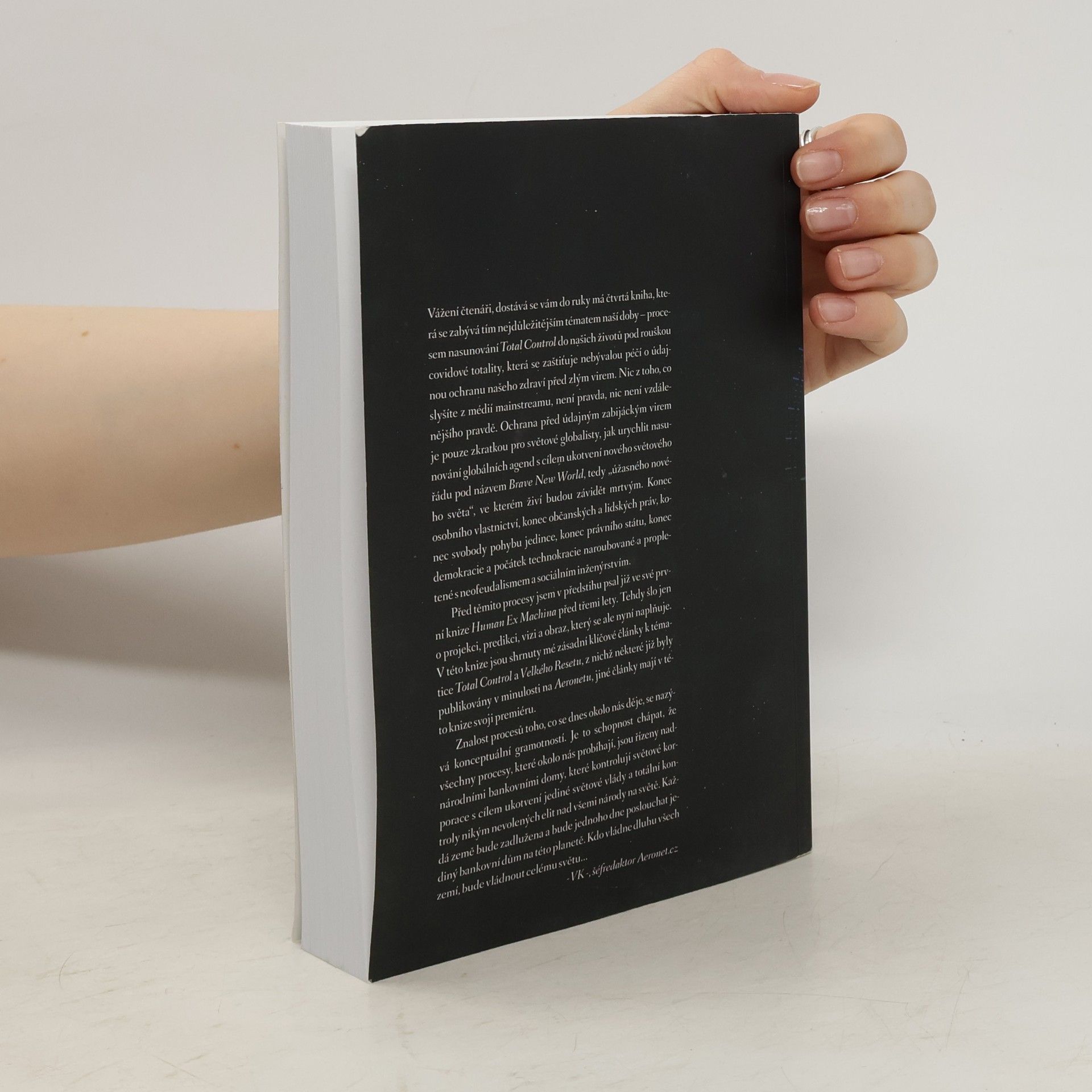 Vážení čtenáři, dostává se vám do ruky má čtvrtá kniha, která se zabývá tím nejdůležitějším tématem naší doby, procesem nasunování Total Control do našich životů pod rouškou covidové totality, která se zaštiťuje nebývalou péčí o údajnou ochranu našeho zdraví před zlým virem. Nic z toho, co slyšíte z médií mainstreamu není pravda, nic není vzdálenějšího pravdě. Ochrana před údajným zabijáckým virem je pouze zkratkou pro světové globalisty, jak zkrátit a urychlit nasunování globálních agend s cílem ukotvení nového světového řádu pod názvem Brave New World, tedy úžasného nového světa, ve kterém živí budou závidět mrtvým. Konec osobního vlastnictví, konec občanských a lidských práv, konec svobody pohybu jedince, konec právního státu, konec demokracie a počátek technokracie naroubované a propletené s neofeudalismem a sociálním inženýrstvím. Před těmito procesy jsem v předstihu varoval a psal o nich již ve své první knize Human Ex Machina. Tehdy šlo jen o projekci, predikci, vizi a obraz, který se ale nyní naplňuje. V této knize jsou shrnuty mé zásadní klíčové články k tématice Total Control a Velkého Resetu, z nichž některé již byly publikovány v minulosti na Aeronetu, jiné články mají v této knize svoji premiéru.