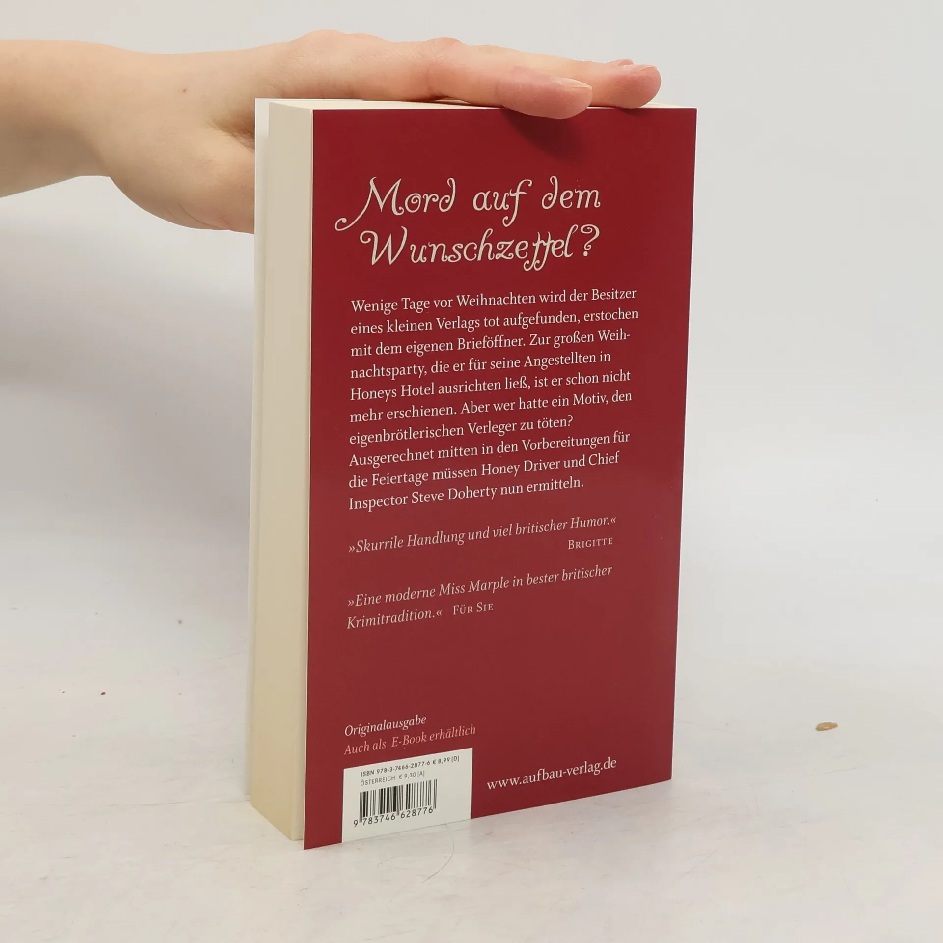 Mord auf dem Wunschzettel? Wenige Tage vor Weihnachten wird der Besitzer eines kleinen Verlags tot aufgefunden, erstochen mit dem eigenen Brieföffner. Zur grossen Weihnachtsparty, die er für seine Angestellten in Honeys Hotel ausrichten liess, ist er schon nicht mehr erschienen. Aber wer hatte ein Motiv, den eigenbrötlerischen Verleger zu töten? Ausgerechnet mitten in den Vorbereitungen für die Feiertage müssen Honey Driver und Chief Inspector Steve Doherty nun ermitteln. 'Skurrile Handlung und viel britischer Humor.' Brigitte 'Eine moderne Miss Marple in bester britischer Krimitradition.' Für Sie Jean G. Goodhind wurde in Bristol geboren. Sie hat bei der Bewährungshilfe gearbeitet und Hotels in Bath und den Welsh Borders geleitet. Ihr Haus im Wye Valley in Wales hat sie verkauft und segelt nun mit ihrer Yacht durchs Mittelmeer, solange es das Wetter zulässt . Die übrige Zeit des Jahres lebt sie in Bath. Im Aufbau Verlag erschienen bisher 'Mord ist schlecht fürs Geschäft' (2009) 'Dinner für eine Leiche' (2009), 'Mord zur Geisterstunde'(2010), 'Mord nach Drehbuch' (2011), 'Mord ist auch eine Lösung' (2011), 'In Schönheit sterben' (2012), 'Der Tod ist kein Gourmet' (2012) und 'Mord zur Bescherung' (2012). Ihr neuer Roman 'Mord zur besten Sendezeit' erscheint im Sommer 2013.