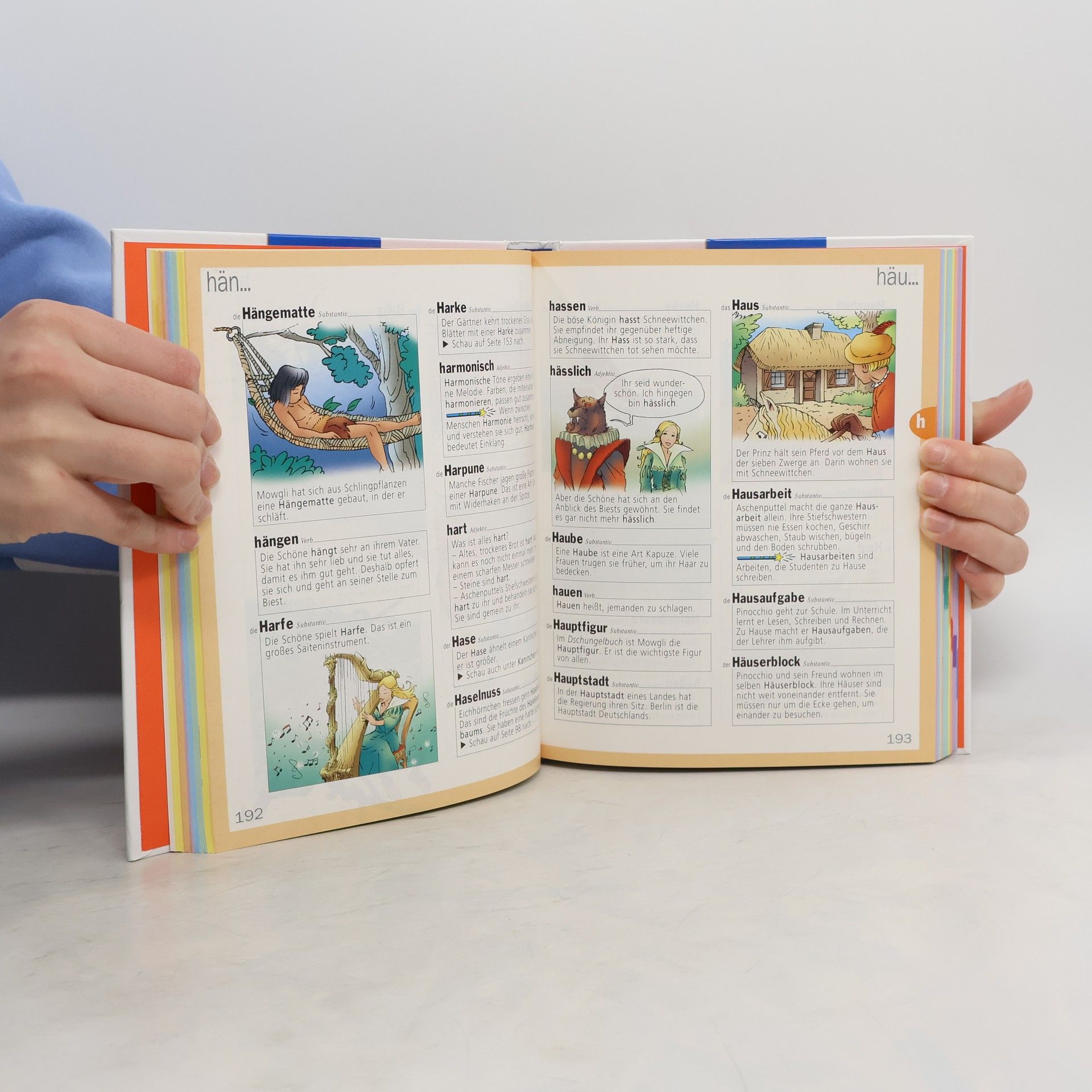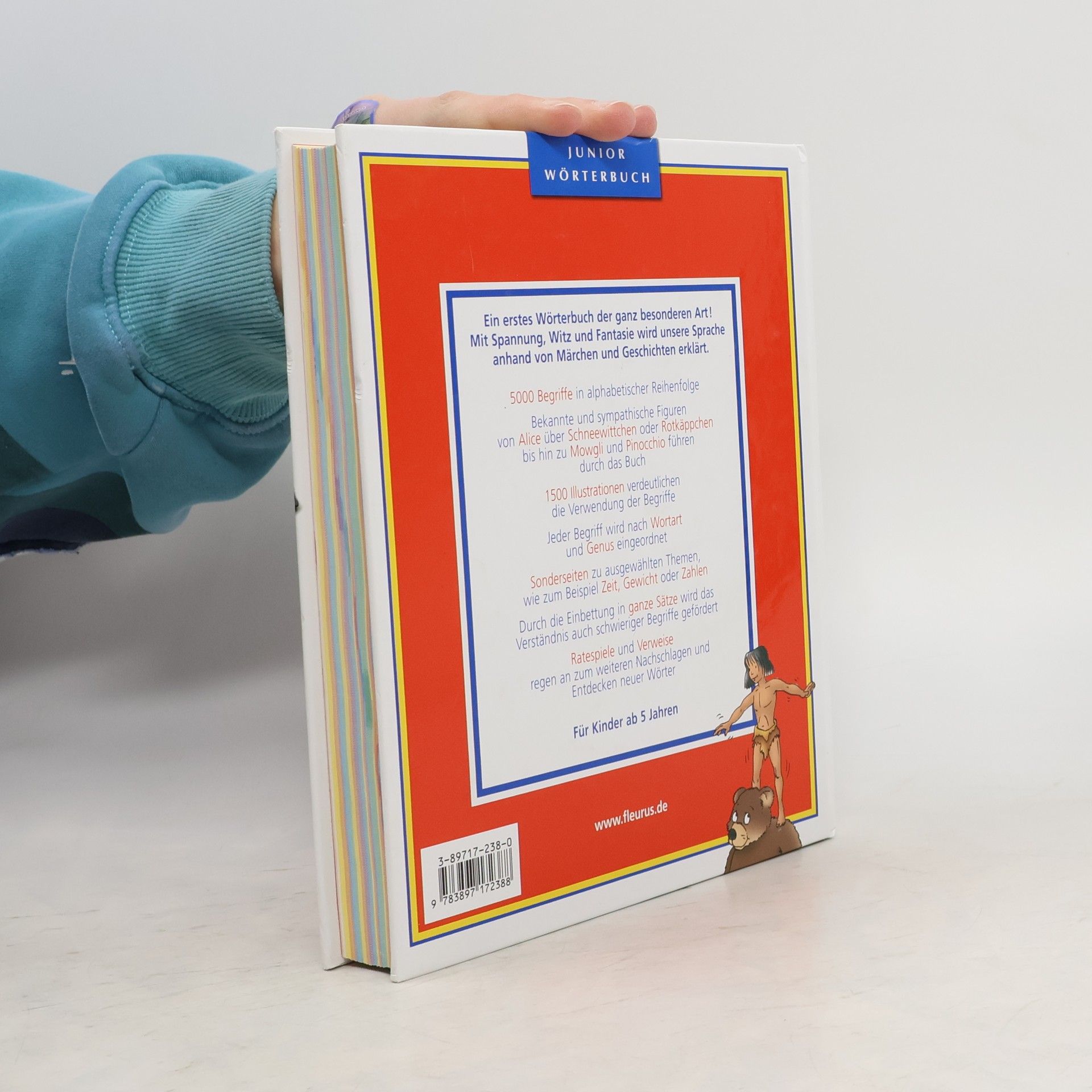 3 Dinge sind es, die das aus dem Französischen übernommene Wörterbuch aus dem Einheitsbrei der Vergleichswerke herausheben: Zum einen die Verknüpfung der ca. 5000 Begriffe von "Aal" bis "zwingen" mit 15 Figuren aus bekannten Märchen und in Deutschland z.T. weniger geläufigen Geschichten (wie "Die Schöne und das Biest"), die es sogar schon NochnichtLesern gestattet, über die Identifikation mit der vertrauten Geschichte einen Wortschatz aufzubauen; dann die konsequente Einbettung der Begriffe in vollständige Sätze, welche das Verständnis auch schwieriger Wörter ermöglicht; schließlich die vielen Ratespiele, Fragen und Verweise, die zum Nachschlagen und Entdecken neuer Wörter anregen. Selbst auf Synonyme und Polyseme wird per "Zauberstab" verwiesen. Der Wörterpool speist sich zumeist aus deutschen Wörtern, die dem Lebensumfeld der Kinder entsprechen ; jedes Wort ist mit Wortart und ggf. Artikel versehen. Dazu 15 Themenseiten (Formen und Figuren; Sinneseindrücke und Gefühle u.a.m.). Für Nachschlageübungen gibt's die entsprechenden typographischen Hilfen. Für Haus, Vor und Grundschule 1.Wahl! . 5000 Wörter in alphabetischer Reihenfolge, deren Bedeutung veranschaulicht wird durch Bilder und Begriffe aus 15 bekannten Märchen und Geschichten. Ab 6.