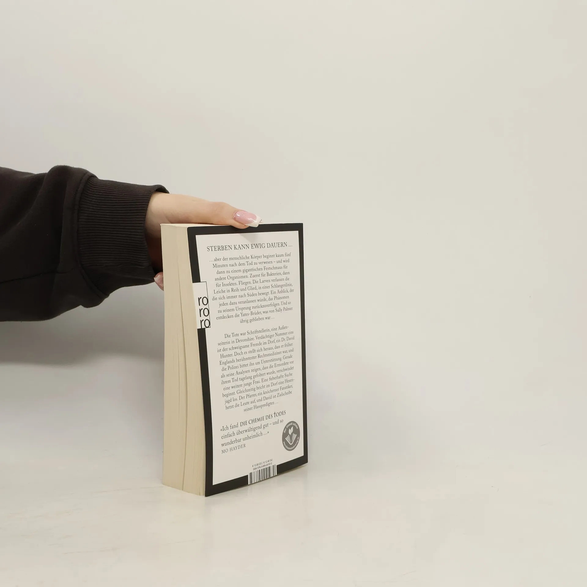 STERBEN KANN EWIG DAUERN ...... aber der menschliche Körper beginnt kaum fünf Minuten nach dem Tod zu verwesen – und wird dann zu einem gigantischen Festschmaus für andere Organismen. Zuerst für Bakterien, dann für Insekten. Fliegen. Die Larven verlassen die Leiche in Reih und Glied, in einer Schlangenlinie, die sich immer nach Süden bewegt. Ein Anblick, der jeden dazu veranlassen würde, das Phänomen zu seinem Ursprungzurückzuverfolgen. Und so entdecken die Yates-Brüder, was von Sally Palmer übrig geblieben war ...Die Tote war Schriftstellerin, eine Außenseiterin in Devonshire. Verdächtiger Nummer eins ist der schweigsame Fremde im Dorf, ein Dr. David Hunter. Doch es stellt sich heraus, dass er früher Englands berühmtester Rechtsmediziner war, und die Polizei bittet ihn um Unterstützung. Gerade als seine Analysen zeigen, dass die Ermordete vor ihrem Tod tagelang gefoltert wurde, verschwindet eine weitere junge Frau. Eine fieberhafte Suche beginnt. Gleichzeitig bricht im Dorf eine Hexenjagd los. Der Pfarrer, ein knöcherner Fanatiker, hetzt die Leute auf, und David ist Zielscheibe seiner Hasspredigten ...«Ich fand die Chemie des Todes einfach überwältigend gut – und so wunderbar unheimlich ...» MO HAYDER
