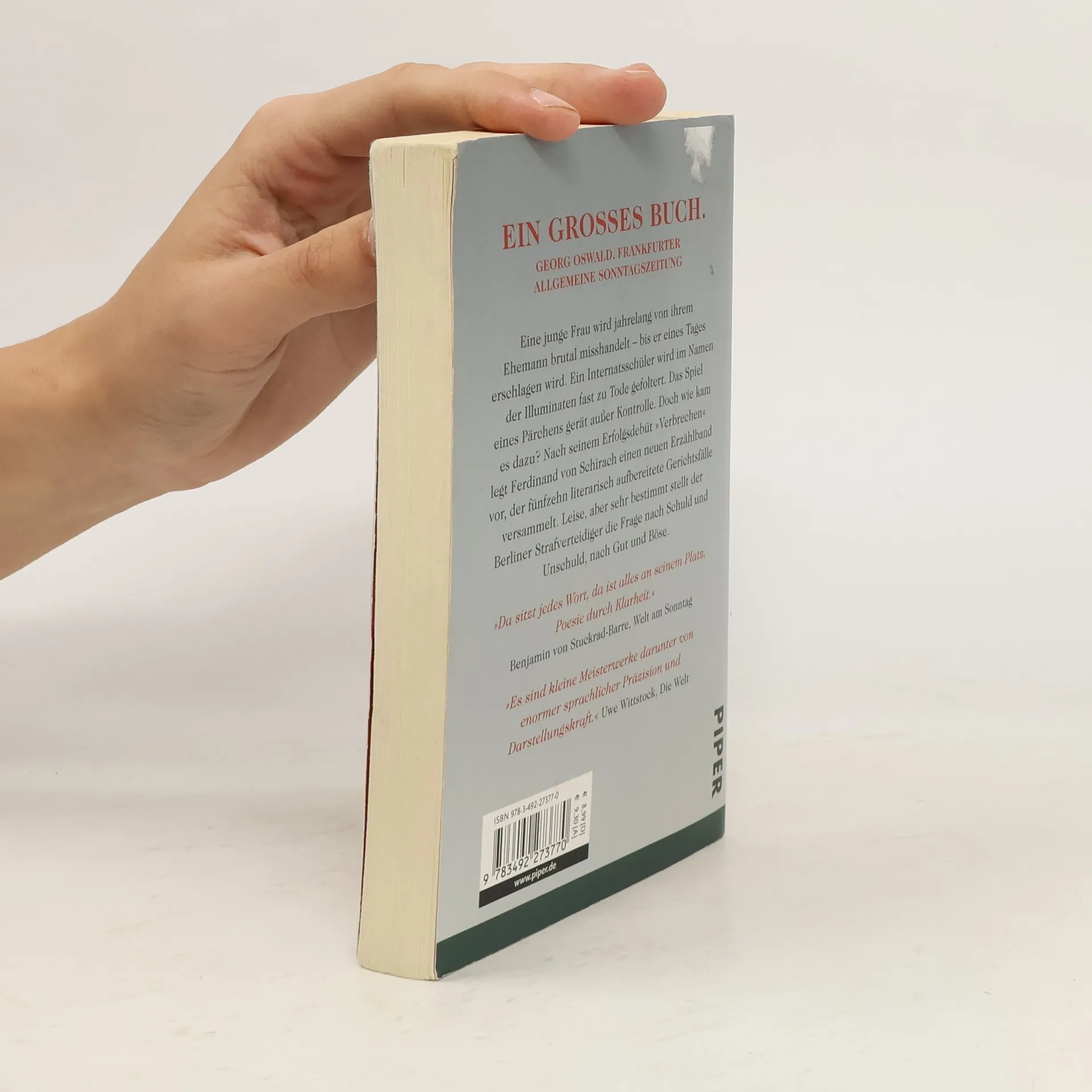Eine junge Frau wird jahrelang von ihrem Ehemann brutal misshandelt – bis er eines Tages erschlagen wird. Ein Internatsschüler wird im Namen der Illuminaten fast zu Tode gefoltert. Das Spiel eines Pärchens gerät außer Kontrolle. Doch wie kam es dazu? Nach seinem Erfolgsdebüt »Verbrechen« legt Ferdinand von Schirach einen neuen Erzählband vor, der 15 literarisch aufbereitete Gerichtsfälle versammelt. Leise, aber sehr bestimmt stellt der Berliner Strafverteidiger die Frage nach Schuld und Unschuld, nach Gut und Böse.