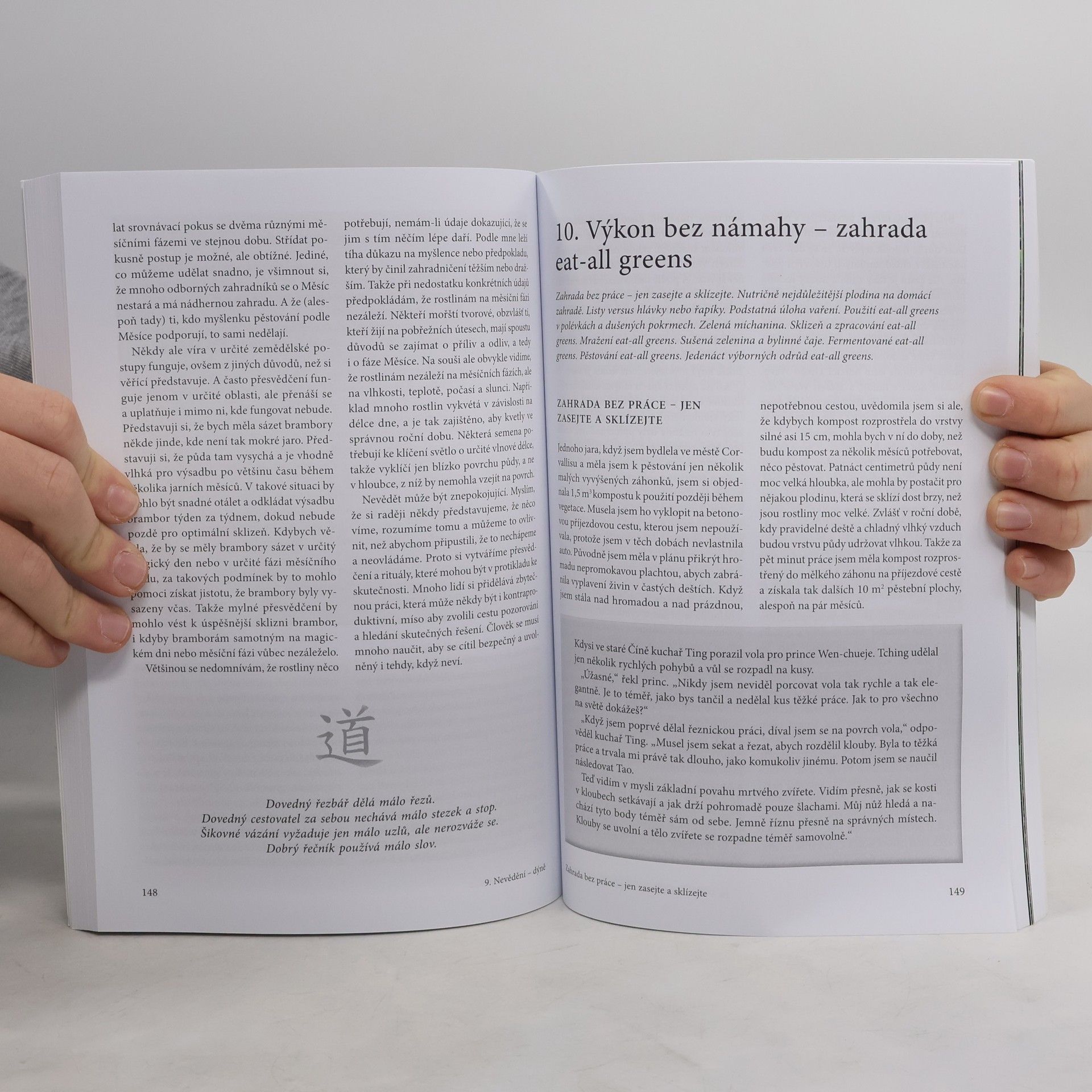 Autorka se v knize zaměřuje na praktické metody a hlubší podstatu zahradničení, přičemž se věnuje oblíbeným zeleninám jako rajčata, fazole, hrách a listová zelenina. Na jejich příkladu ukazuje základní principy a postupy potřebné k úspěšnému pěstování jakékoliv jedlé plodiny. Inspirována taoismem, kniha je uspořádána podle jeho myšlenek a nabízí praktické rady pro zahradníky v oblastech jako jsou organické metody proti plísni bramborové, šlechtění rezistence tradičních odrůd, zakládání domácí semenné banky a dlouhodobé skladování semen. Dále obsahuje doporučení, kde nesázet stromy, a důvody, proč se vyhnout pěstování některých druhů zeleniny. Autorka také představuje novou metodu pěstování naťových zelenin, která zvyšuje výnosy na menší ploše a vyžaduje méně práce. Tato metoda umožňuje rodinám pěstovat veškerou naťovou zeleninu pro léto, zmrazení a sušení na zimu, což je ideální pro malé zahrady a městské pěstitele. Kniha je určena zahradníkům všech úrovní a poskytuje jedinečný pohled na přírodu, zahradu a nás samotné.