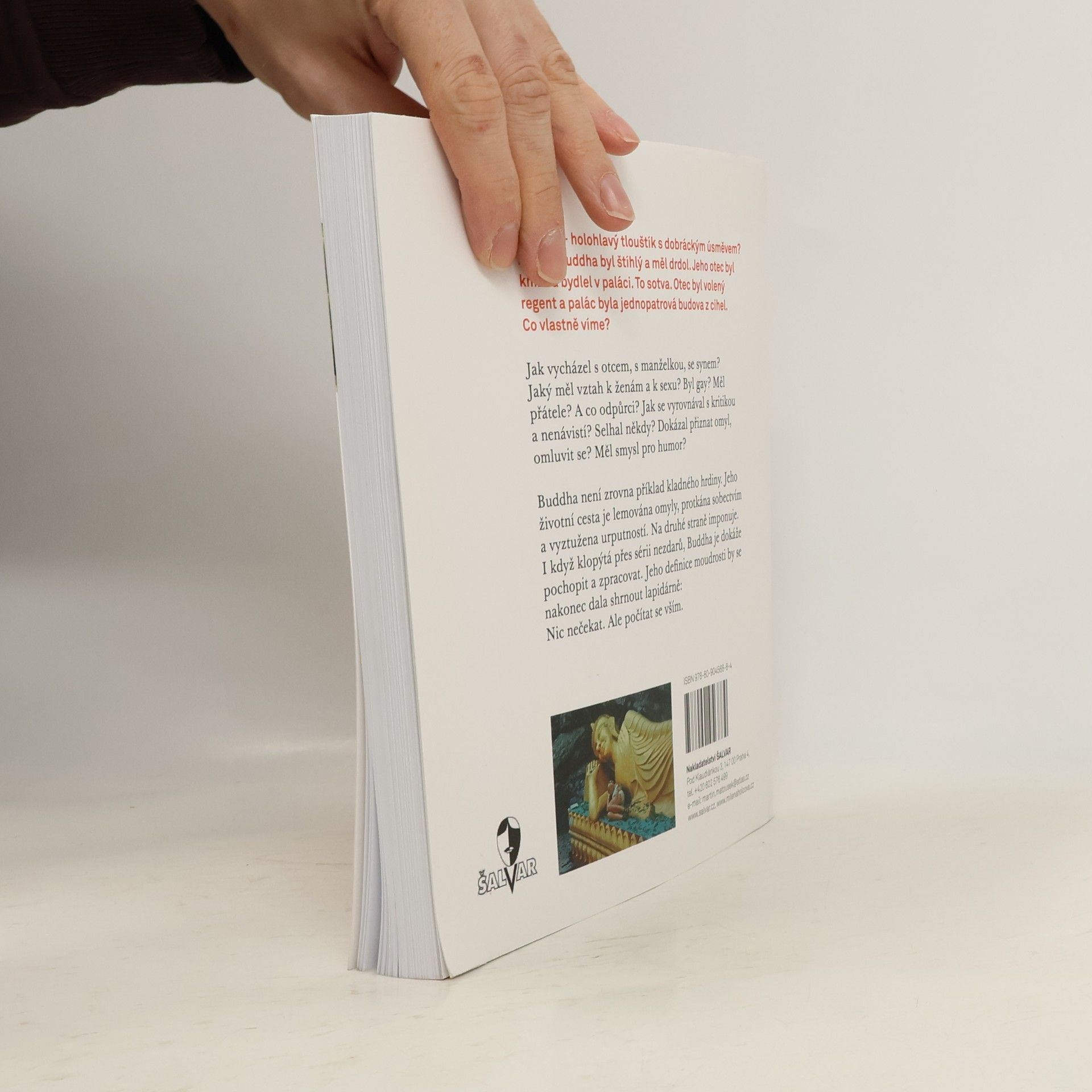 Buddha - holohlavý tlouštík s dobráckým úsměvem? Mýtus! Buddha byl štíhlý a měl drdol. Jeho otec byl kníže a bydlel v paláci. To sotva. Otec byl volený regent a palác byla jednopatrová budova z cihel. Co vlastně víme? Známe základní životní příběh s několika zvraty. A dál? Jak vycházel s otcem, s manželkou, se synem? Jaký měl vztah k ženám a k sexu? Byl gay? Měl přátele? A co odpůrci? Jak se vyrovnával s kritikou a nenávistí? Selhal někdy? Dokázal přiznat omyl, omluvit se? Měl smysl pro humor? Buddha není zrovna příklad kladného hrdiny. Jeho životní cesta je lemována omyly, protkána sobectvím a vyztužena urputností. Na druhé straně imponuje. I když klopýtá přes sérii nezdarů, Buddha je dokáže pochopit a zpracovat. Jeho definice moudrosti by se nakonec dala shrnout lapidárně: Nic nečekat. Ale počítat se vším. Nedocenitelná knížka pro multikulturní poznávání všech generací, pro školy, mimoškolní , určitě pro vnímavé, inteligentní čtenáře.