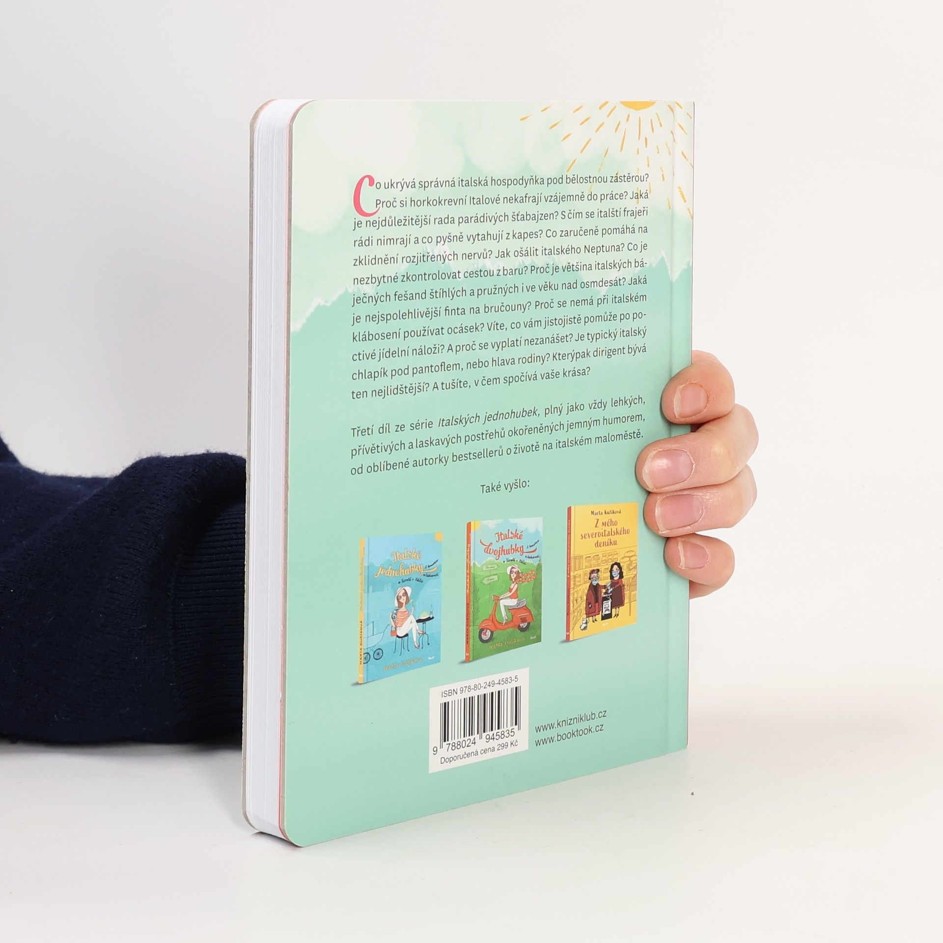Co ukrývá správná italská hospodyňka pod svou bělostnou zástěrou? Proč si horkokrevní Italové nekafrají vzájemně do práce? Jaká je nejdůležitější rada parádivých šťabajzen? S čím se italští frajeři rádi nimrají a co pyšně vytahují ze svých kapes? Co zaručeně pomáhá na zklidnění rozjitřených nervů? Jak ošálit italského Neptuna? Proč si každý Ital všimne, ale žádná Italka nepochválí, a přesto je to fajn? Co je nezbytné zkontrolovat cestou z baru? Proč je většina italských báječných fešand štíhlých a pružných i ve věku nad osmdesát? Jaká je nejspolehlivější finta na bručouny? Proč se nemá při italském klábosení používat ocásek? Víte, co vám jistojistě pomůže po poctivé jídelní náloži? A proč se vyplatí nezanášet? Je typický italský chlapík pod pantoflem, nebo hlavou rodiny? Kterýpak dirigent bývá ten nejlidštější? A tušíte, v čem spočívá vaše krása? Třetí díl ze série Italských jednohubek, plný jako vždy lehkých, přívětivých a laskavých postřehů okořeněných jemným humorem, od oblíbené autorky bestsellerů o životě na italském maloměstě
