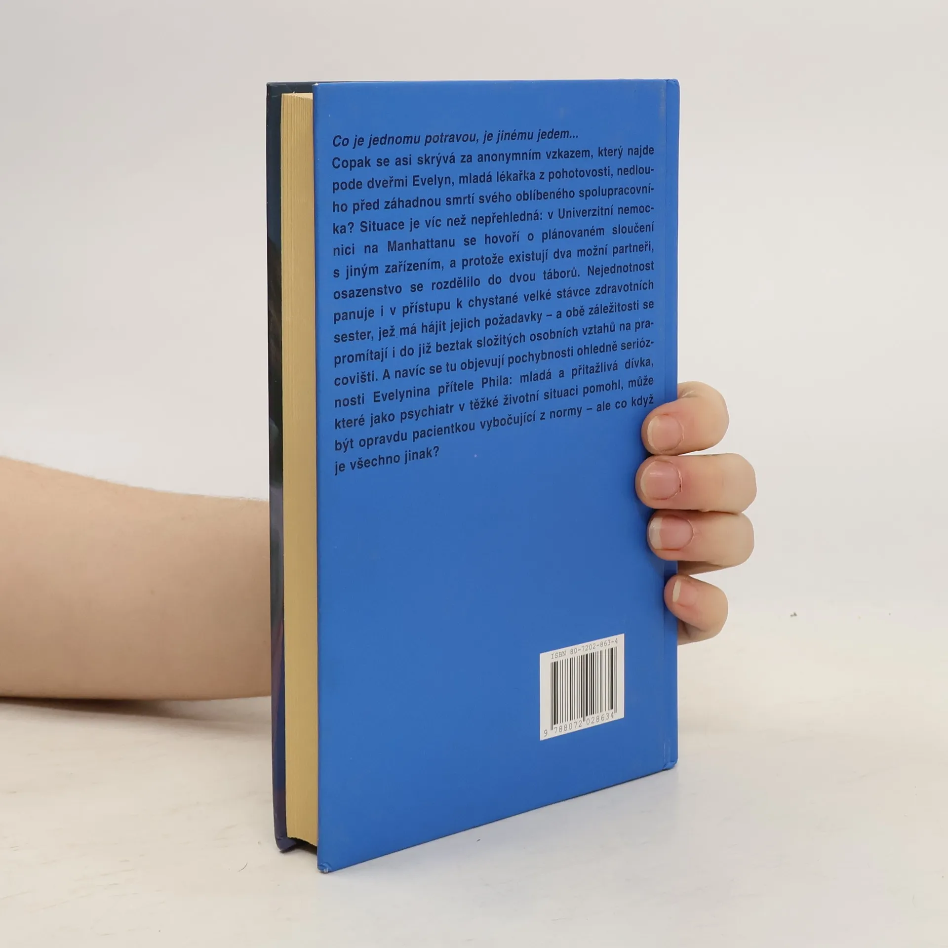 Co je jednomu potravou, je jinému jedem... Copak se asi skrývá za anonymním vzkazem, který najde pode dveřmi Evelyn, mladá lékařka z pohotovosti, nedlouho před záhadnou smrtí svého oblíbeného spolupracovníka? Situace je víc než nepřehledná: v Univerzitní nemocnici na Manhattanu se hovoří o plánovaném sloučení s jiným zařízením, a protože existují dva možní partneři, osazenstvo se rozdělilo do dvou táborů. Nejednotnost panuje i v přístupu k chystané stávce zdravotních sester - a obě záležitosti se promítají i do již beztak složitých osobních vztahů na pracovišti. A navíc se tu objevují pochybnosti ohledně serióznosti Evelynina přítele Phila: mladá a přitažlivá dívka, které jako psychiatr v těžké životní situaci pomohl, může být opravdu pacientkou vybočující z normy - ale co když je všechno jinak?
