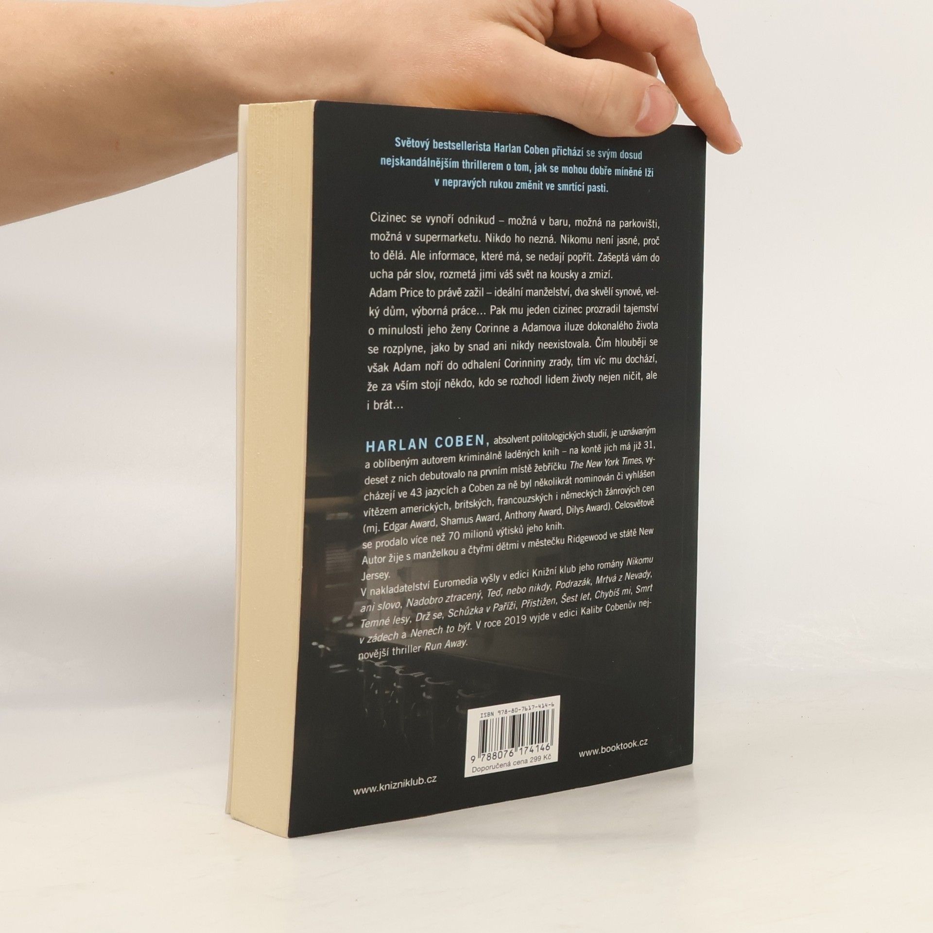 Světový bestsellerista Harlan Coben přichází se svým dosud nejskandálnějším thrillerem o tom, jak se mohou dobře míněné lži v cizích rukou změnit ve smrtící pasti. Cizinec se vynoří odnikud – možná v baru, možná na parkovišti, možná v supermarketu. Nikdo ho nezná. Nikomu není jasné, proč to dělá. Ale informace, které má, se nedají popřít. Zašeptá vám do ucha pár slov, rozmetá jimi váš svět na kousky a zmizí. Adam Price to právě zažil – ideální manželství, dva skvělí synové, velký dům, výborná práce…Pak mu jeden cizinec prozradil tajemství o minulosti jeho ženy Corinne a Adamova iluze dokonalého života se rozplyne, jako by snad ani nikdy neexistovala. Čím hlouběji se však Adam noří do odhalení Corinniny zrady, tím víc mu dochází, že za vším stojí někdo, kdo se rozhodl některým lidem životy nejen ničit, ale i brát…