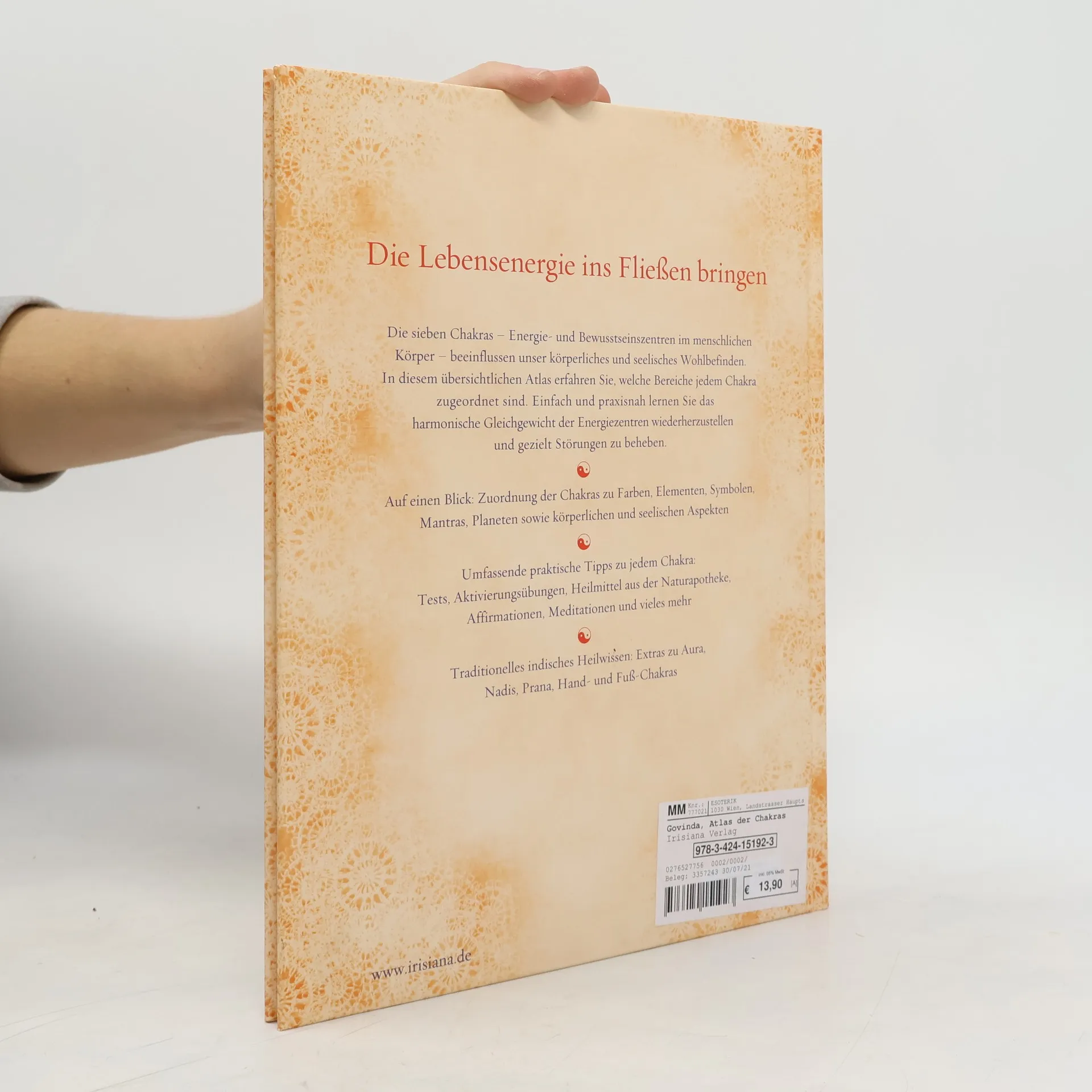 Die anschauliche Übersichten zu den sieben Chakras Die Arbeit an den Chakras – die sieben Energiezentren im menschlichen Körper – hat eine jahrtausendealte Tradition. Dieser opulent bebilderte Atlas zeigt Ihnen alles Wissenswerte über Ursprung und Symbolik der Chakras sowie ihre Bedeutung für Gesundheit, persönliche Entwicklung und spirituelles Wachstum. Durch einfache, traditionelle Übungen und Atemtechniken aus dem Kundalini-Yoga können Sie lernen, die Energiezentren zu aktivieren.Neben kurzen Tests, die einen Überblick über die eigene Chakra-Aktivität ermöglichen, finden Sie Zuordnungen zu Edelsteinen, Mantras, Aromaölen und Farben sowie die organischen und physiologischen Entsprechungen. Ausstattung: Mit über 40 farbigen Illustrationen und Fotos