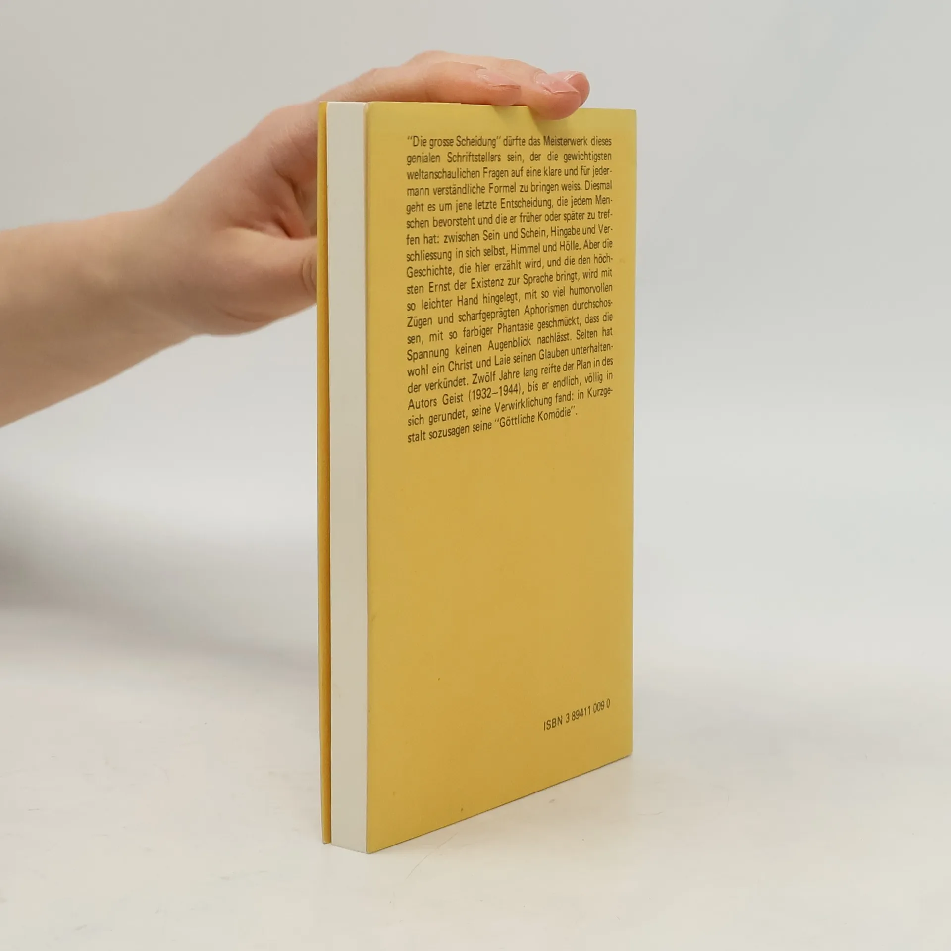 «Die große Scheidung» dürfte das Meisterwerk dieses genialen Schriftstellers sein, der die gewichtigsten weltanschaulichen Fragen auf eine klare und für jedermann verständliche Formel zu bringen weiß. Diesmal geht es um jene letzte Entscheidung, die jedem Menschen bevorsteht und die er früher oder später zu treffen hat: zwischen Sein und Schein, Hingabe und Verschließung in sich selbst, Himmel und Hölle. Aber die Geschichte, die hier erzählt wird, und die den höchsten Ernst der Existenz zur Sprache bringt, wird mit so leichter Hand hingelegt, mit so viel humorvollen Zügen und scharfgeprägten Aphorismen durchschossen, mit so farbiger Phantasie geschmückt, dass die Spannung keinen Augenblick nachlässt. Zwölf Jahre lang (1932-1944) reifte der Plan im Geiste des Autors, bis er endlich, völlig in sich gerundet, seine Verwirklichung fand: in Kurzgestalt sozusagen seine «Göttliche Komödie».